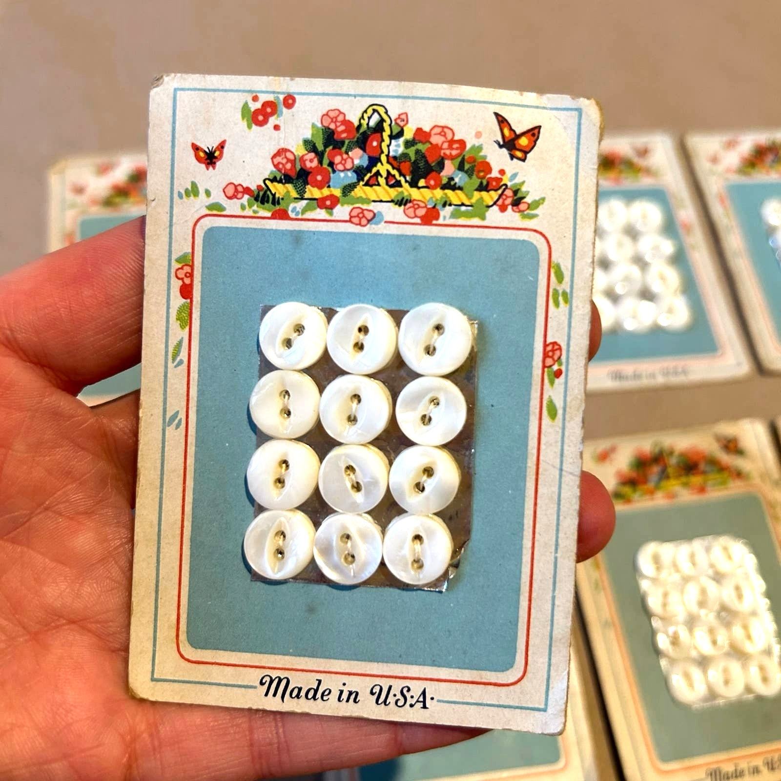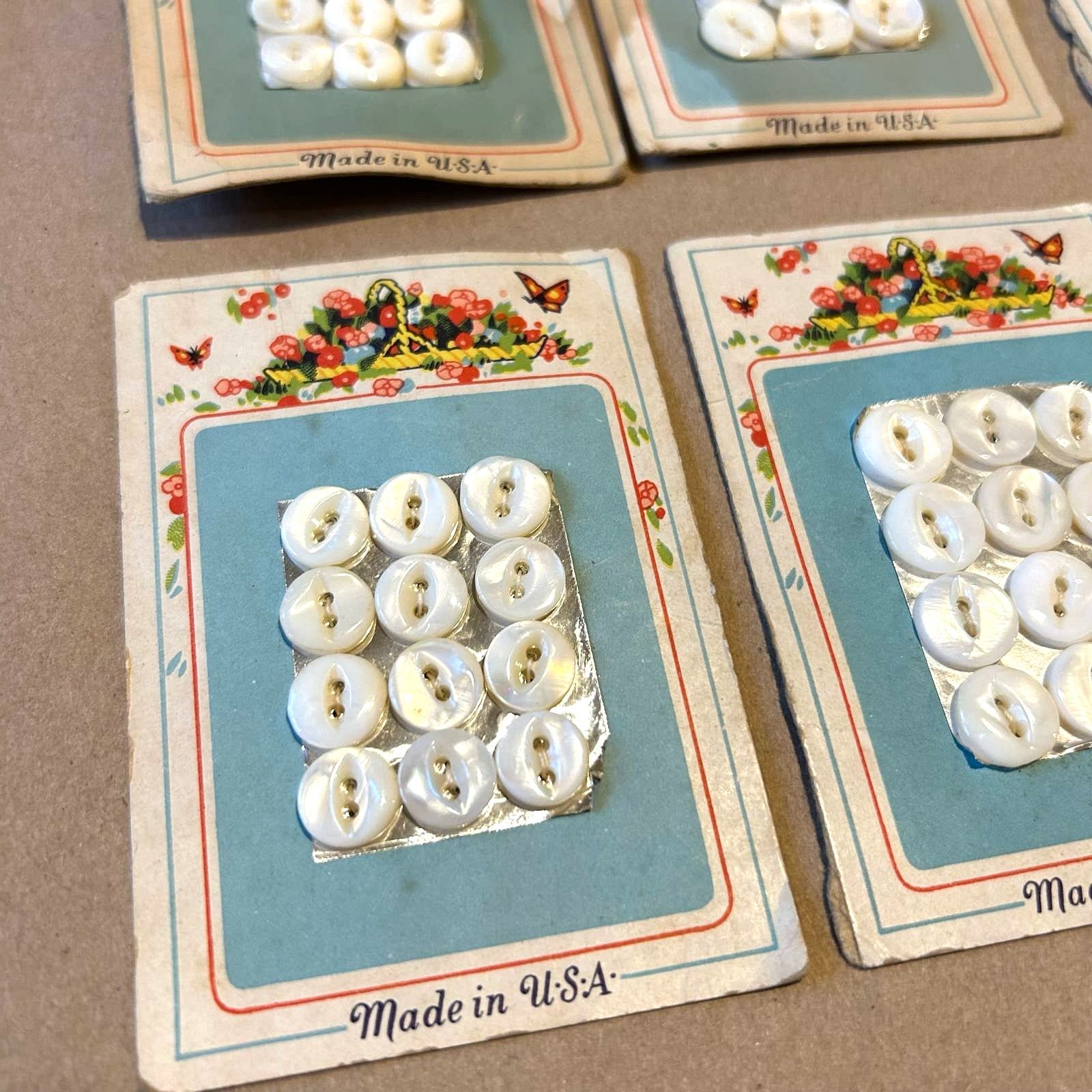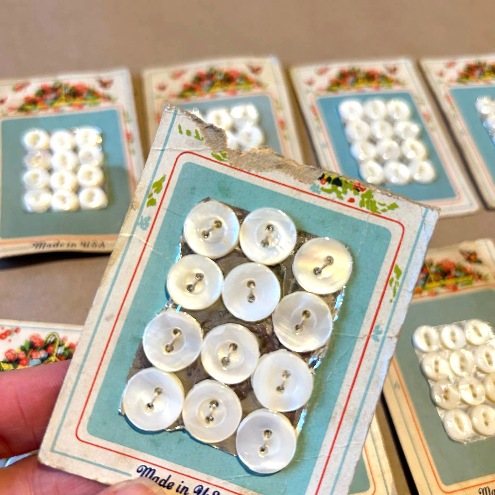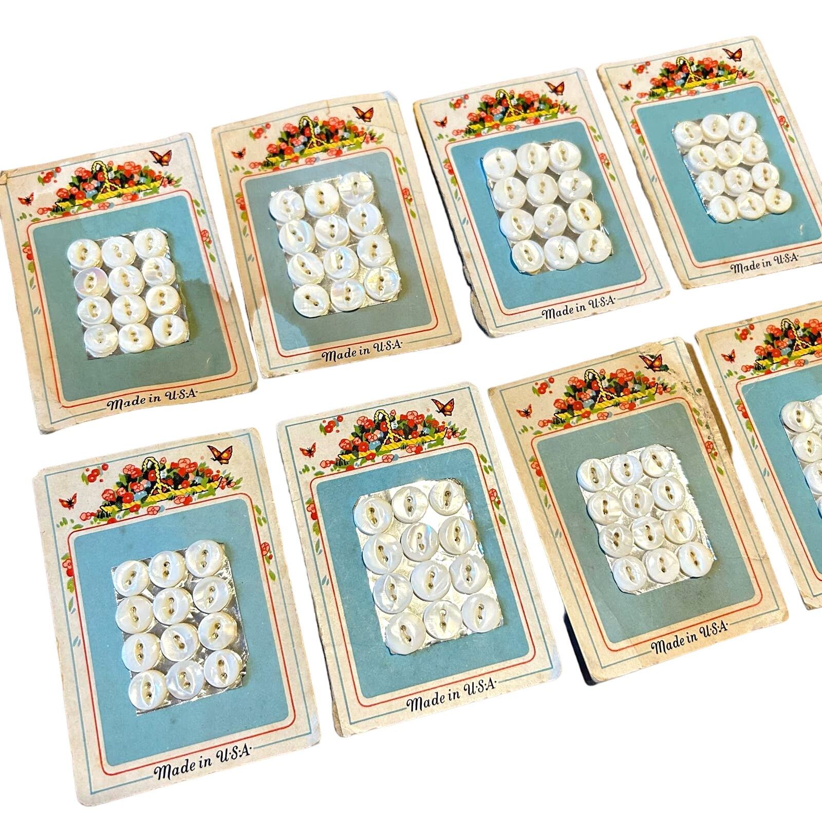 Lot of nine vintage button cards featuring small mother of pearl buttons, each card marked Made in U.S.A.. Shimmering shell finish with beautiful natural variations. Cards show mild age wear but remain intact with full button sets attached.