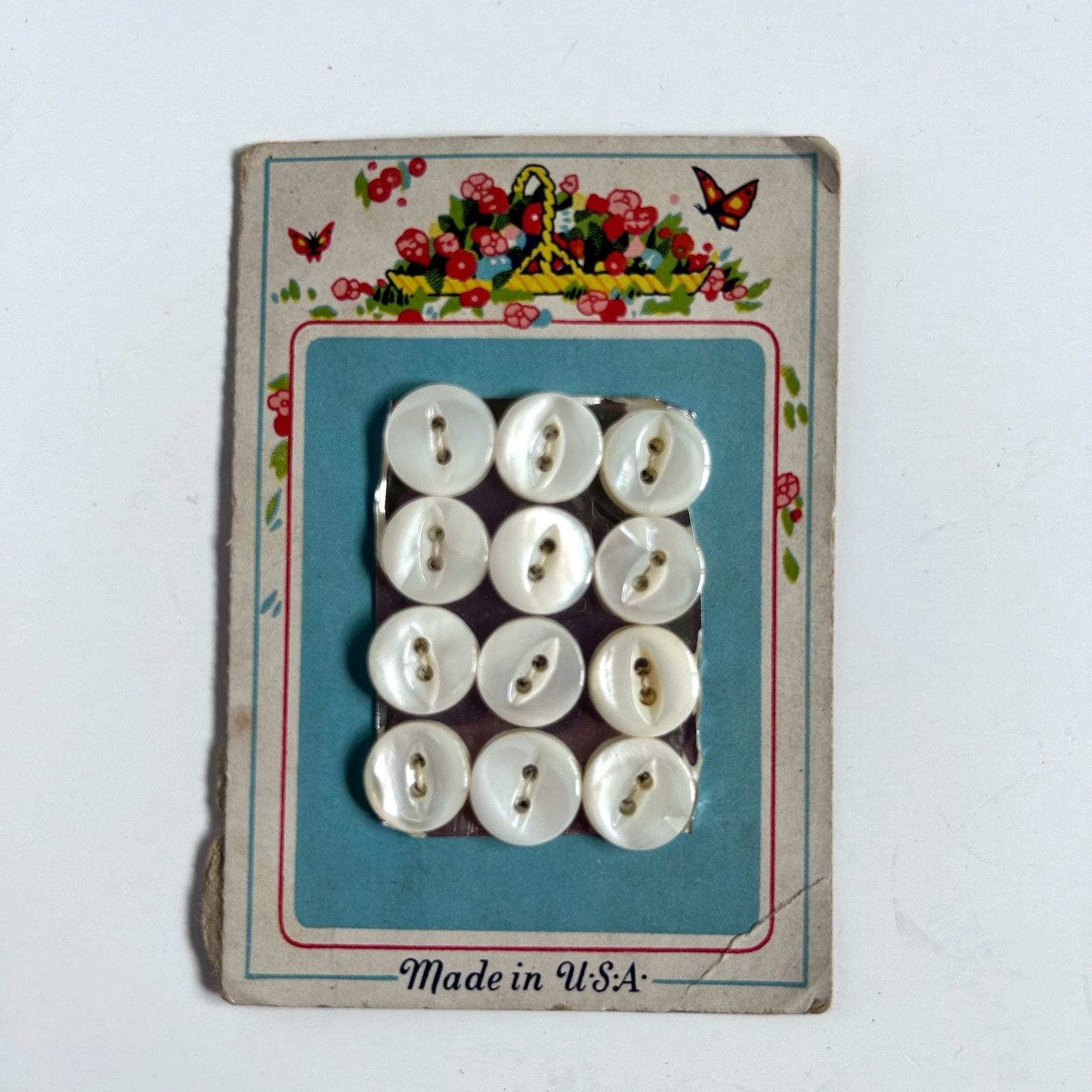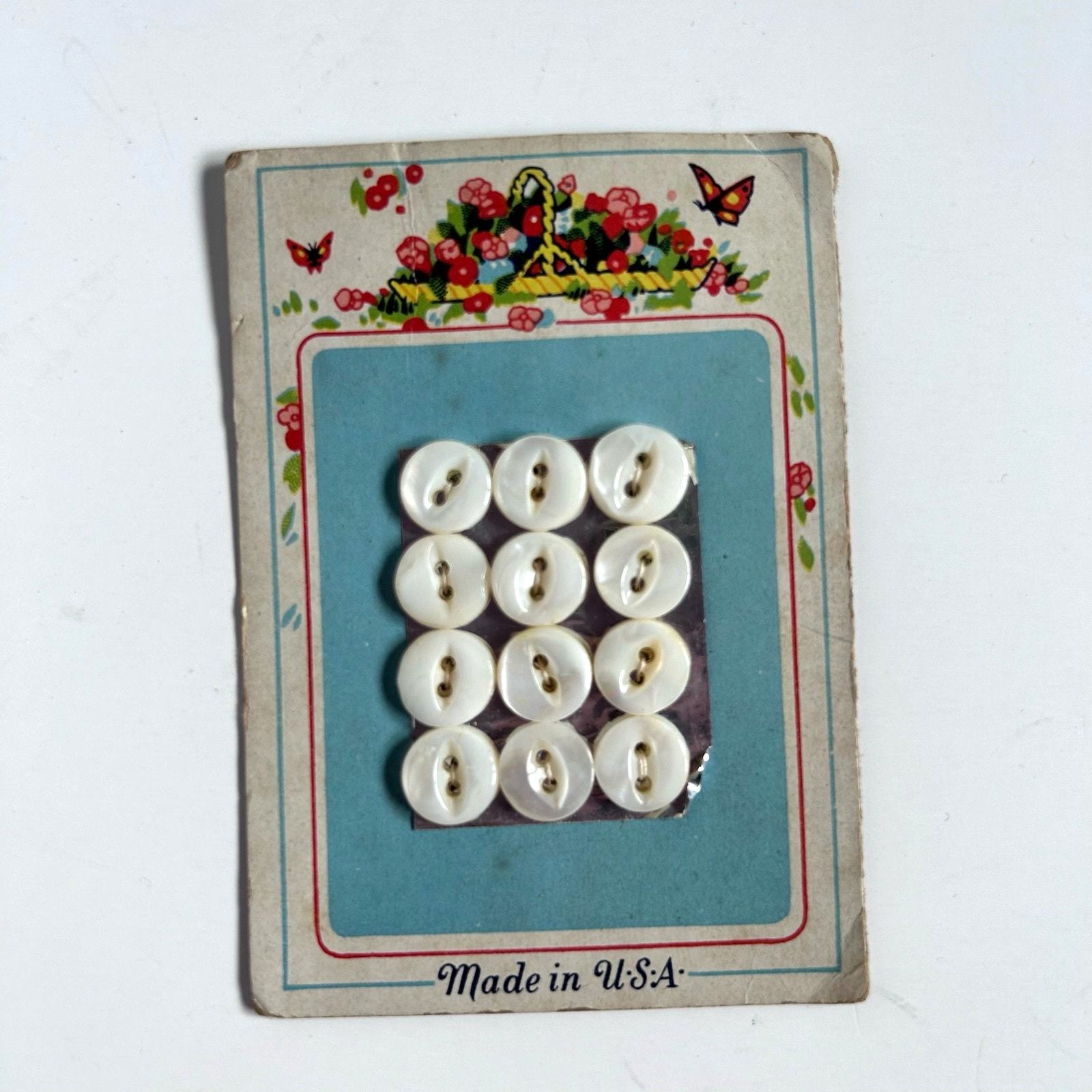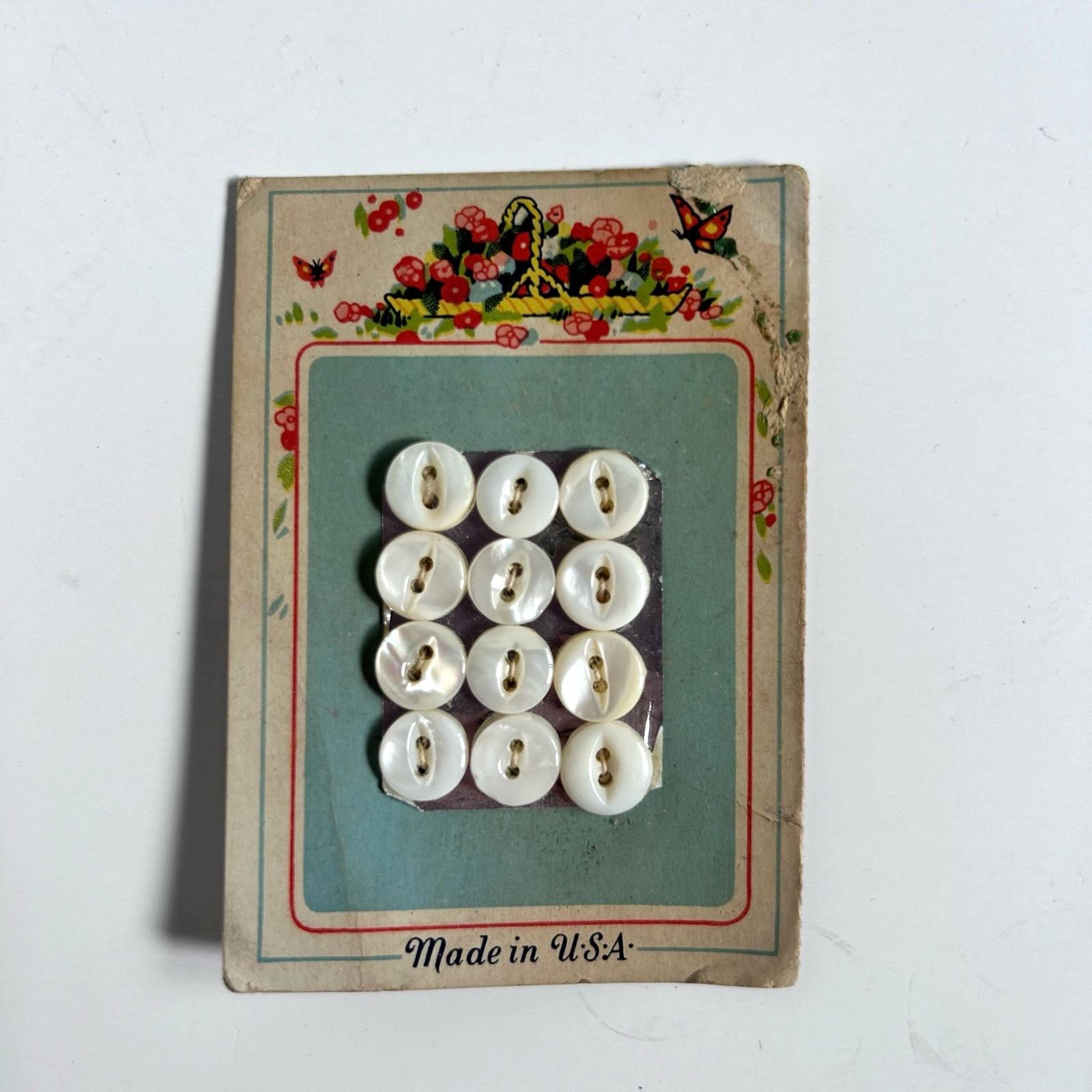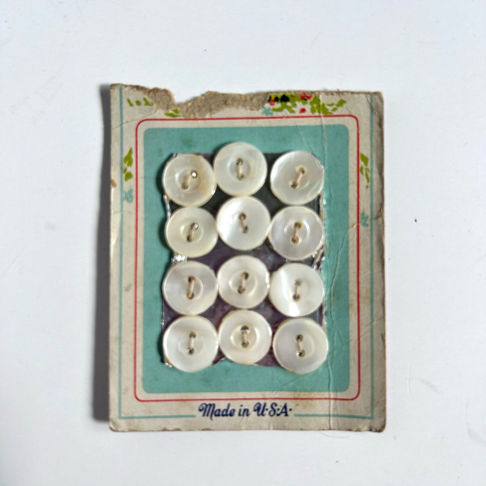 Lot of nine vintage button cards featuring small mother of pearl buttons, each card marked Made in U.S.A.. Shimmering shell finish with beautiful natural variations. Cards show mild age wear but remain intact with full button sets attached.