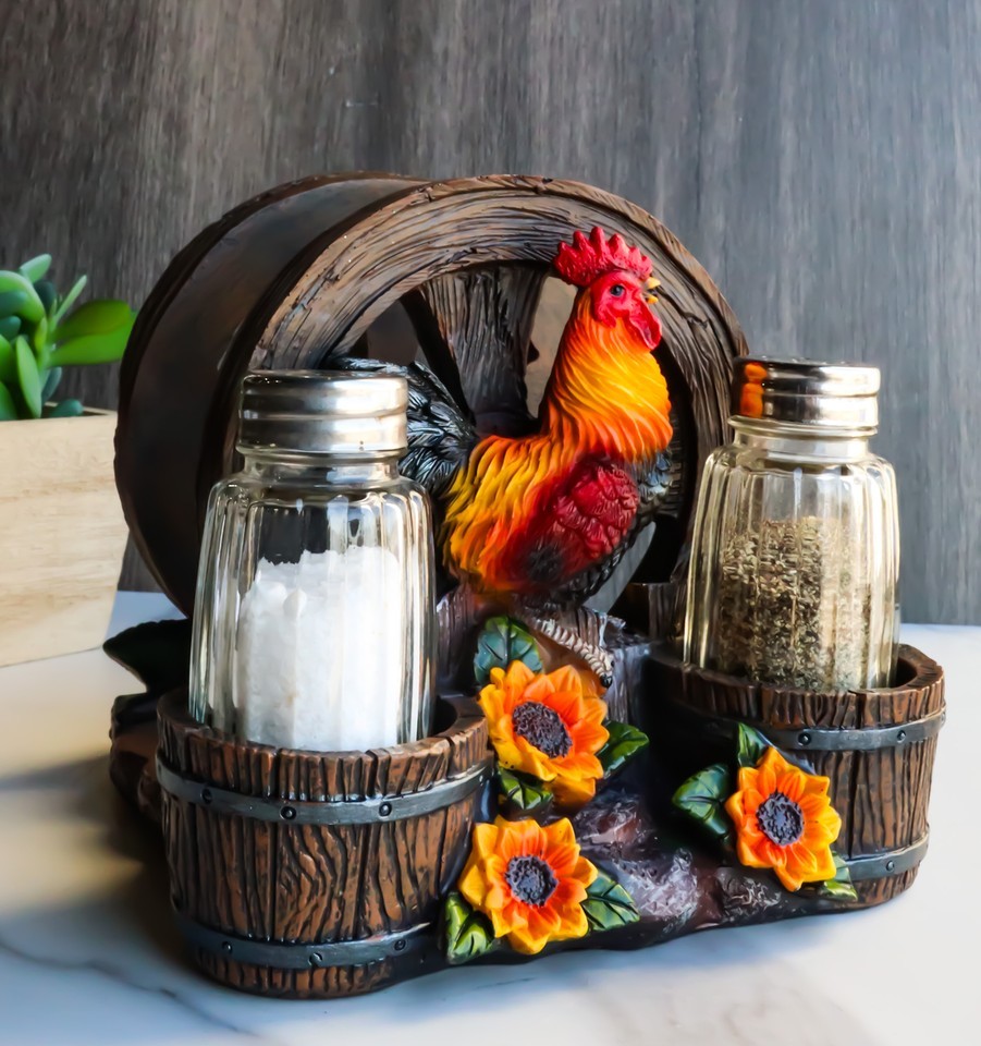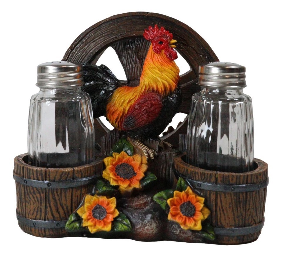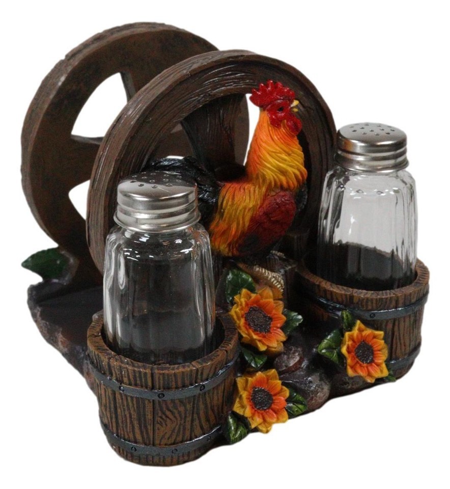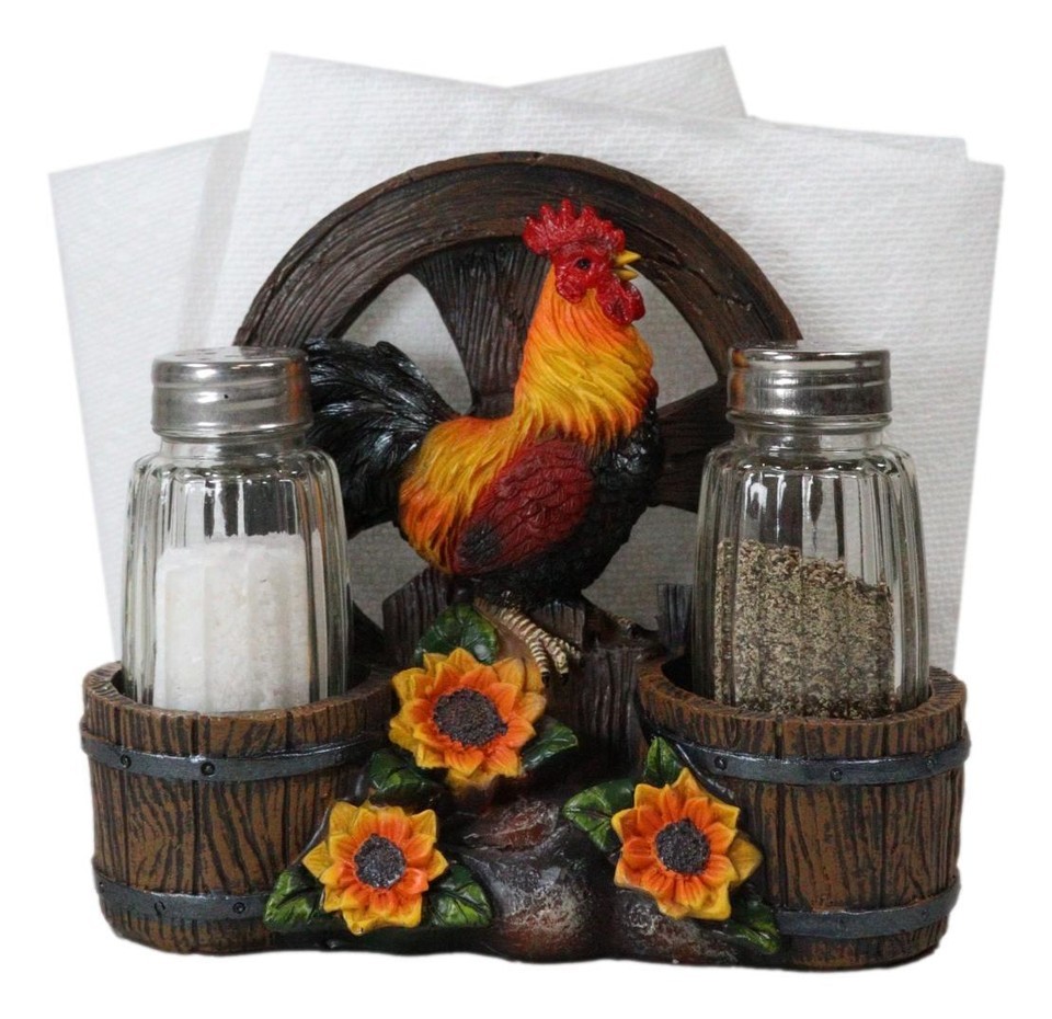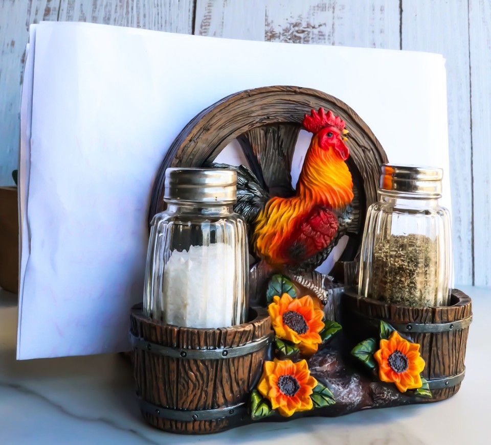 ? Add a splash of farm fresh atmosphere to your mealtime table with this decorative rooster napkin and salt pepper shakers holder! The sculpture boasts of a proud rooster chicken standing on a bed of sunflowers by two wooden farm barrels to store your glass shakers. Behind the rooster is a large set of wagon wheels to store your dinner paper napkins.