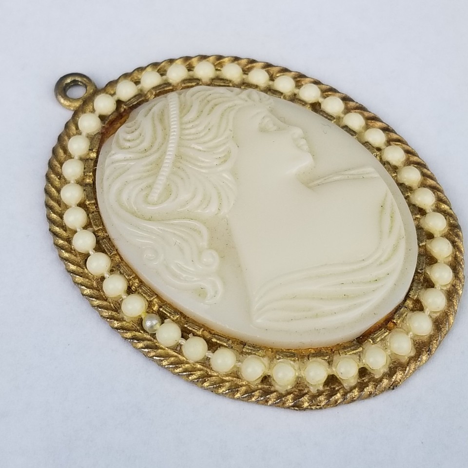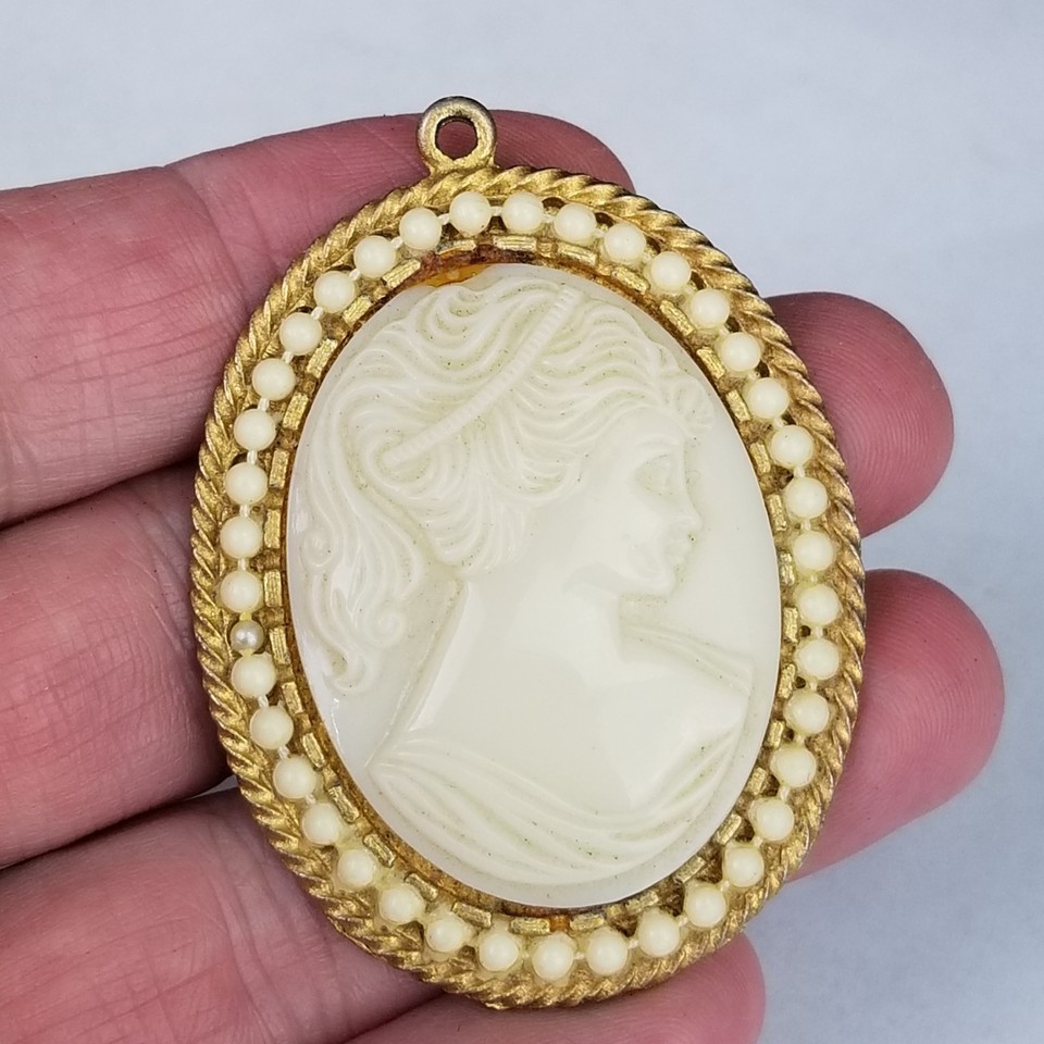 vintage cameo pendant ladie gold tone pearl bead cream LARGE 2"