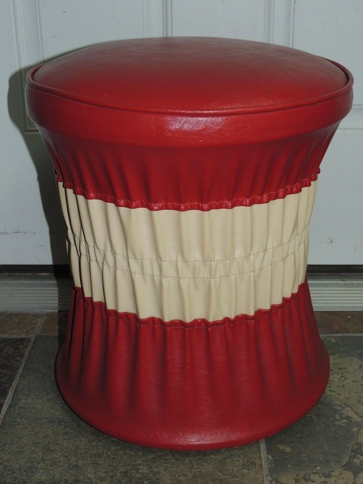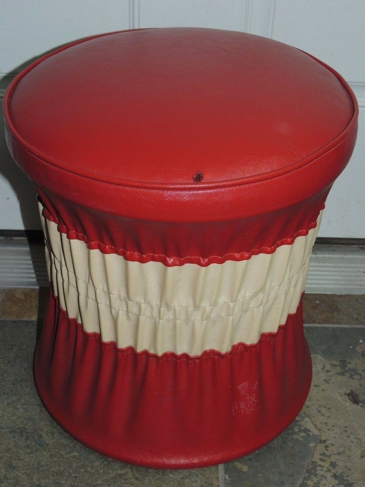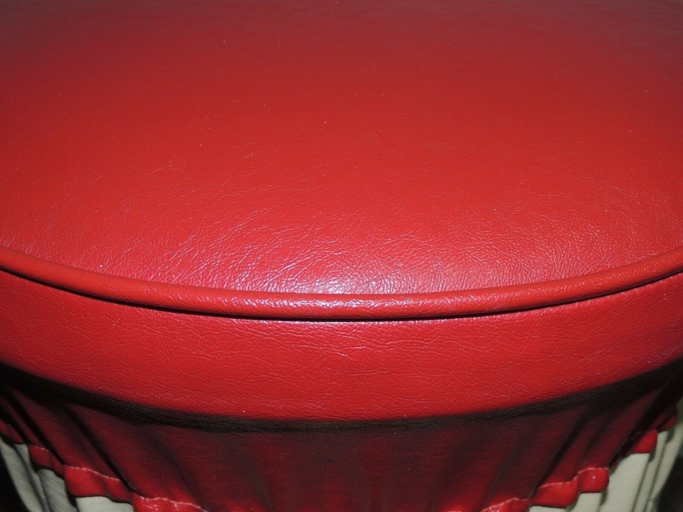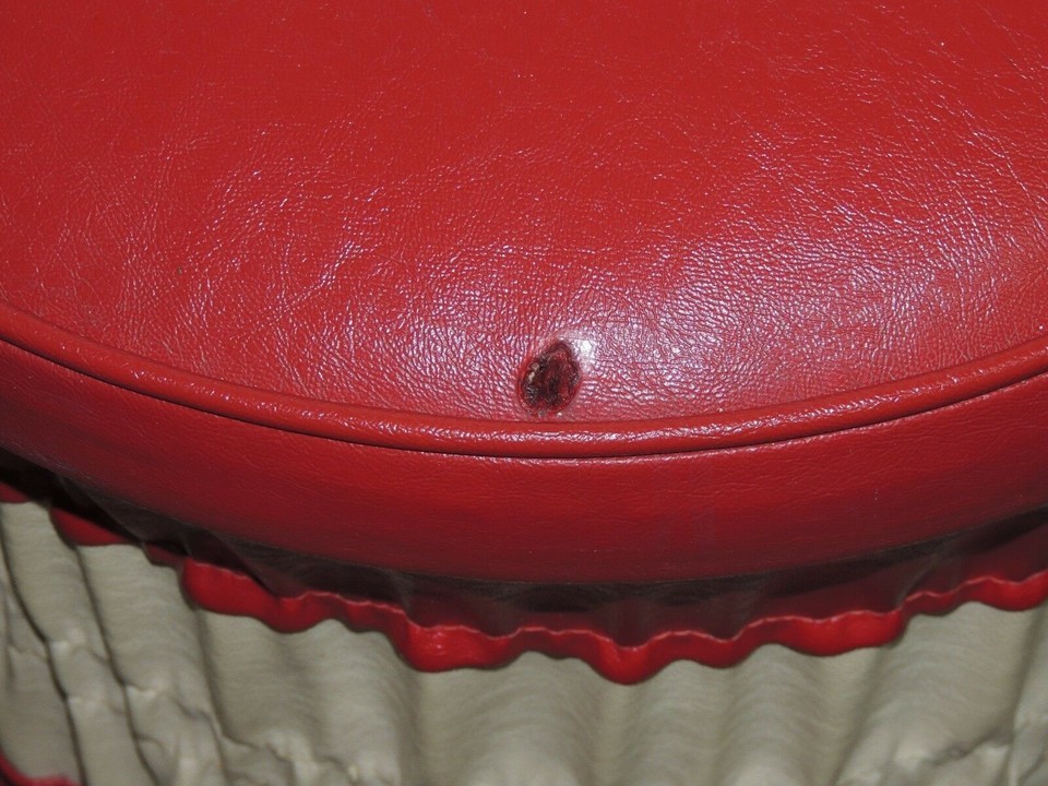 Round Footstool 16" Red & White Naugahyde Vinyl Mid Century Retro Ottoman burn