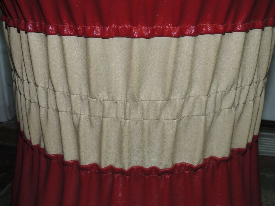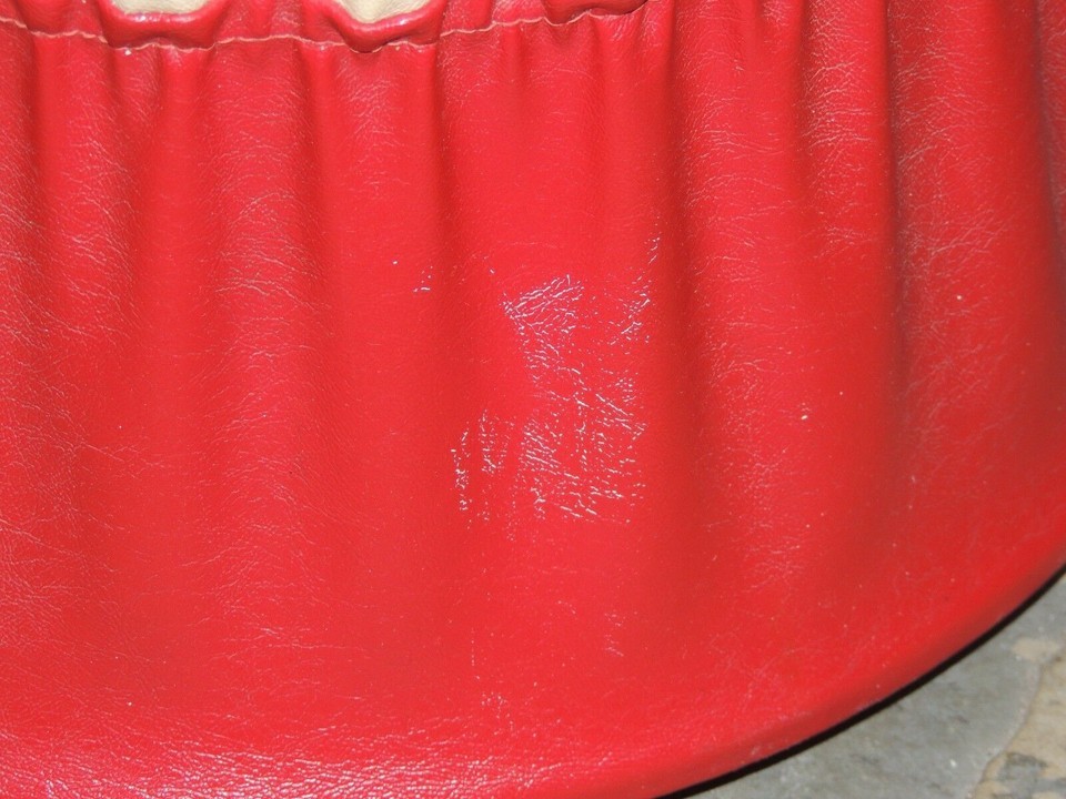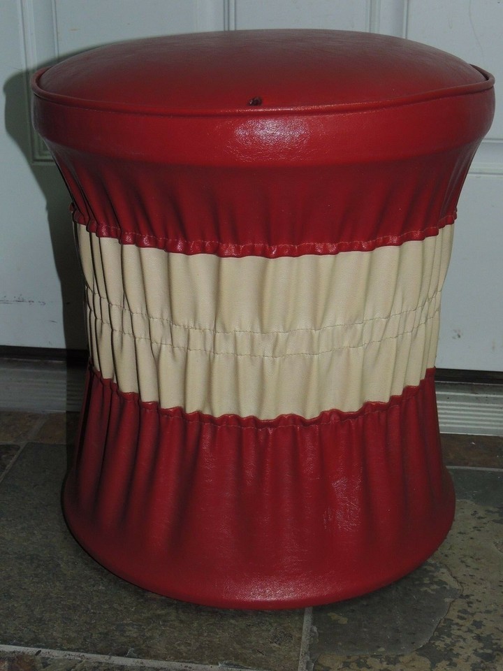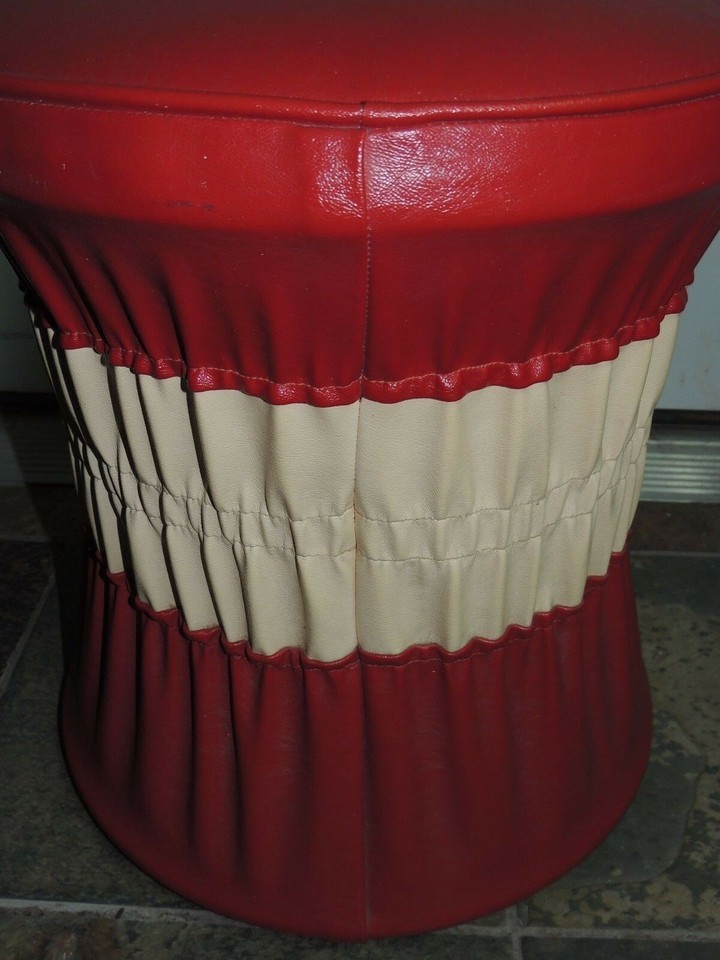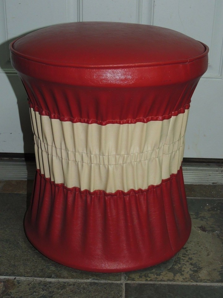 Round Footstool 16" Red & White Naugahyde Vinyl Mid Century Retro Ottoman burn