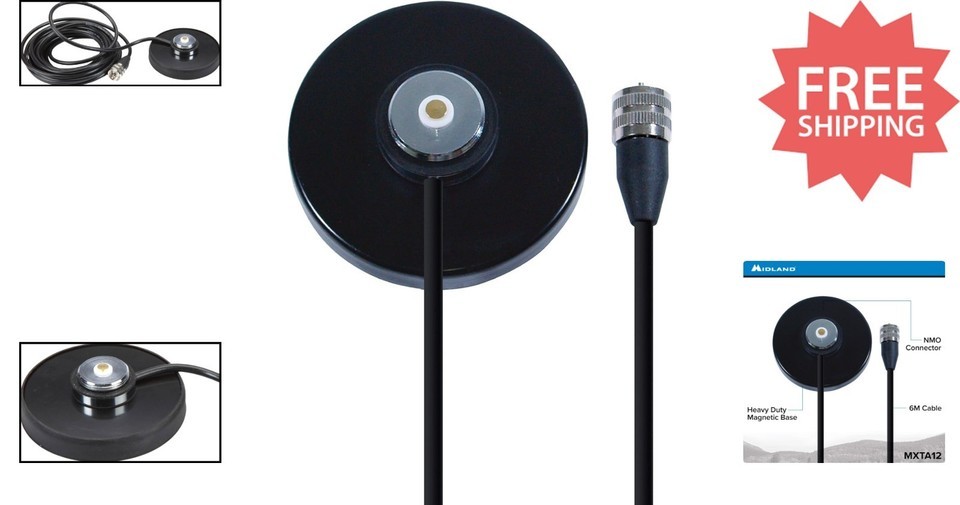 Empower your mobile communications with Midland's Magnetic Antenna Mount. Designed for strength and versatility, this mount features an NMO connector for reliable signal transmission across 0-1000 MHz. Easy to install without drilling, the magnetic attachment allows for quick adjustments to optimize performance. The 3.5-inch diameter mount includes a protective rubber boot and a 20-foot RG-58A/U cable for flexible setup. Please note, the antenna is not included. Packaged with the MXTA12 Antenna Mount and owner?s manual, it?s the perfect solution for enhanced connectivity.