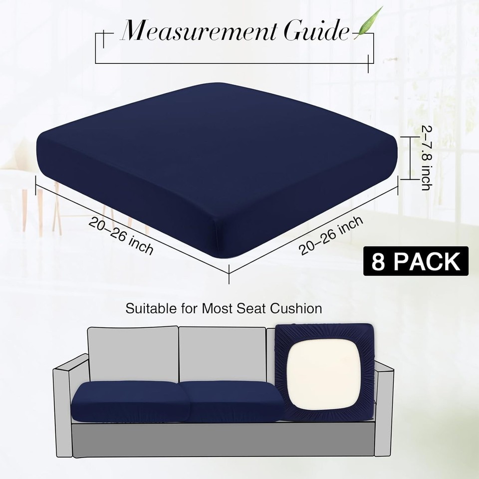 Enhance your home decor with our set of 8 elastic sofa cushion covers, designed for cushions measuring 20-27 inches in length and width, and 2-7 inches in height. Crafted from soft, stretchable, wrinkle-free spandex polyester fabric, these covers offer a snug fit and durability, making them ideal for most sofa and chair cushions. Their vibrant colors and stylish patterns breathe new life into old furniture, while providing protection against wear, scratches, and spills ? perfect for homes with kids and pets. Versatile and easy to maintain, these covers are machine washable and suitable for various uses, including sofa, dining chairs, and camping seats. Please measure your cushions before ordering to ensure a perfect fit.