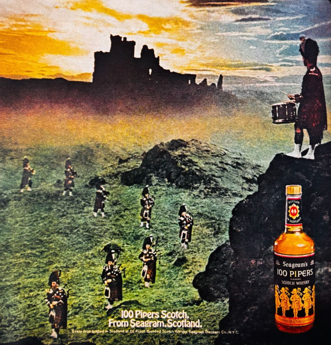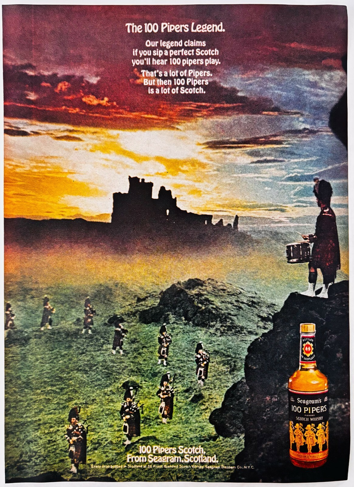 1970 Seagram's 100 Pipers Scotch Whisky Advertisement Scottish Legend F15P
