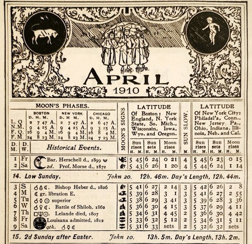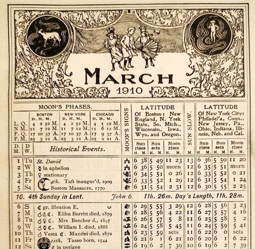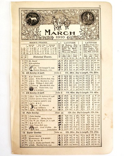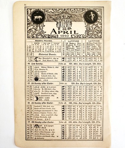 March April 1910 Calendar Page Moon Phases Sun Double Sided Ephemera ADBN1eee