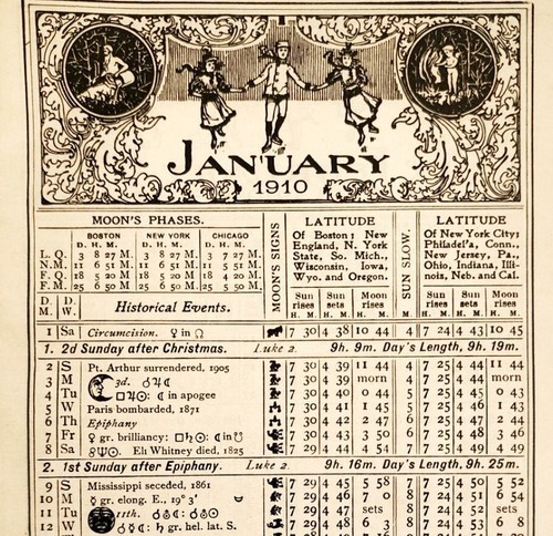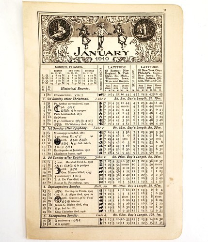 January February 1910 Calendar Page Moon Phase Sun Double Side Ephemera ADBN1eee