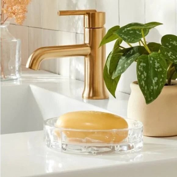 Features: Sculpted clear glass soap dish Perfect size for your go-to bar soap Works well with any existing bathroom decor Glass is easy to wipe clean Dimensions 4" x 5"