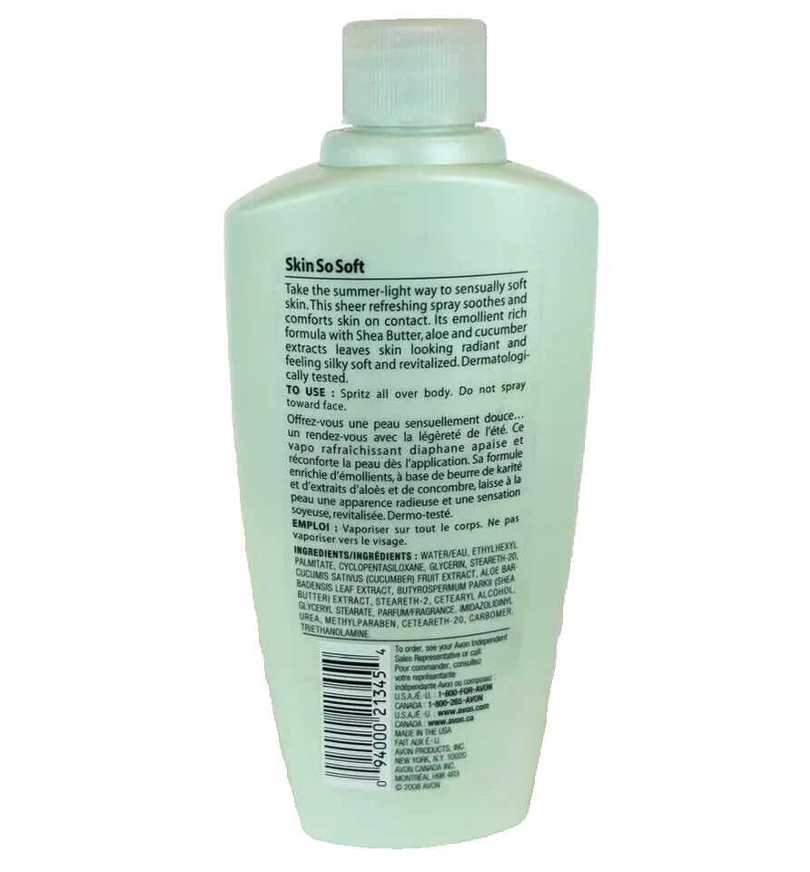 The Avon Skin So Soft Summer Soft Revitalizing Body Spray Lotion is a refreshing body spray lotion that aims to soothe and comfort the skin. It features an emollient-rich formula with ingredients like Shea Butter, Aloe, and Cucumber extracts to leave your skin looking radiant and feeling silky soft.