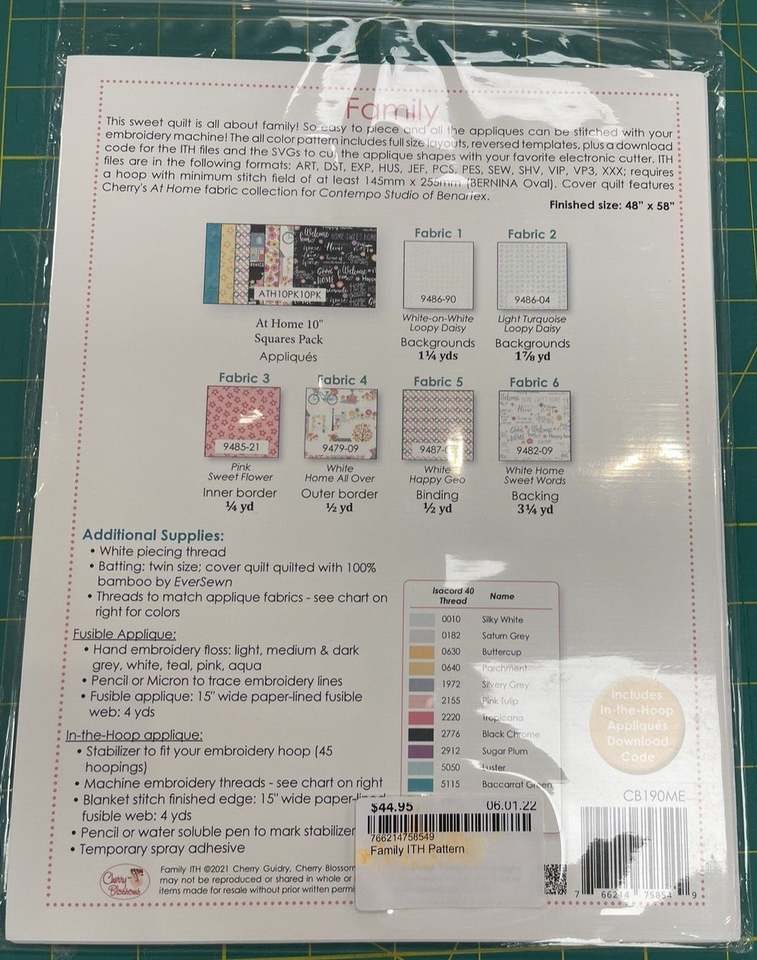 FAMILY" In the hoop applique Embroidery" Quilt Pattern by Cherry Blossoms NEW