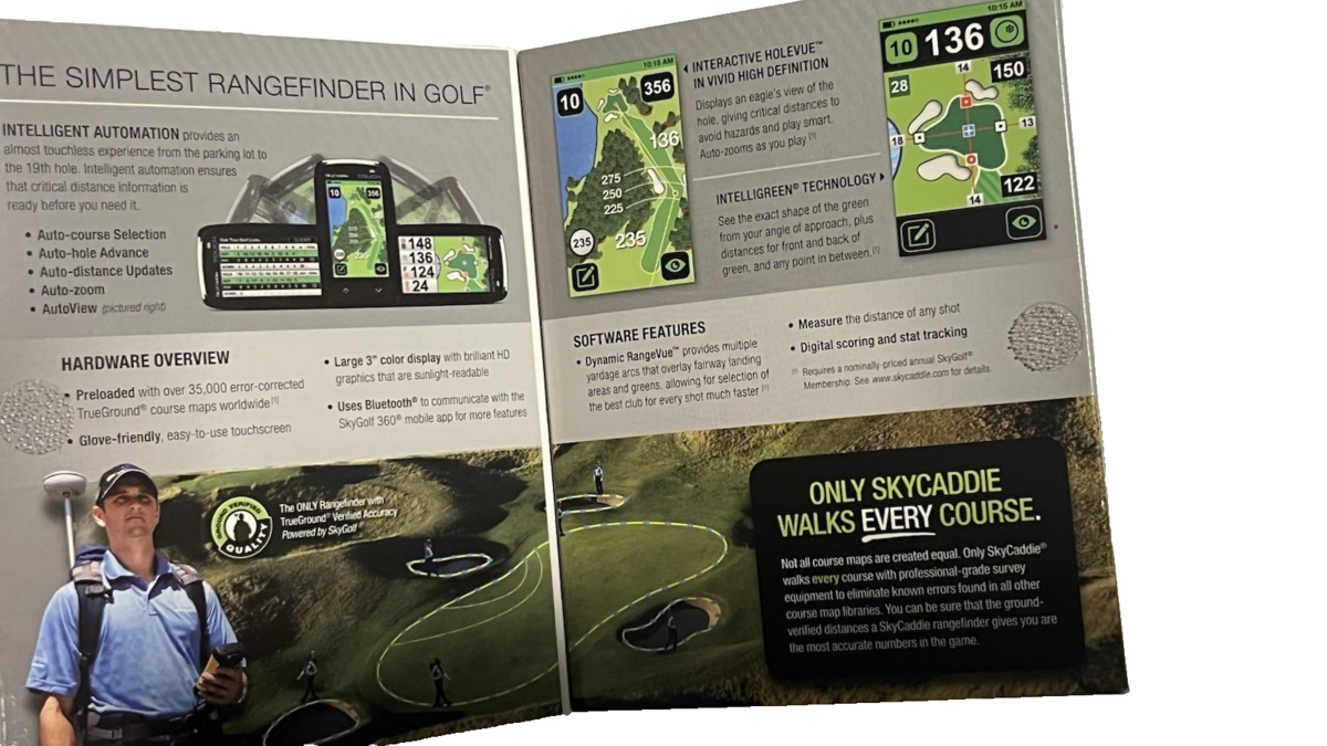 Using Bluetooth technology the rangefinder communicates with "SkyGolf 360" to communicate distance, score, and layout.