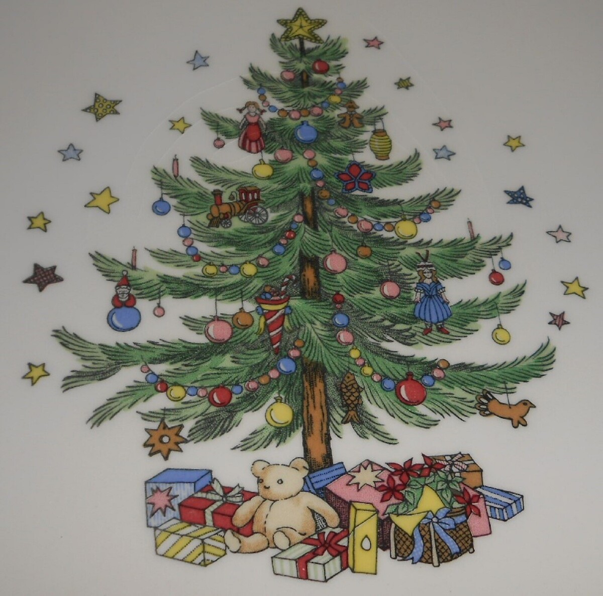 This is the 11" Cake Plate from Nikko in the Happy Holidays Pattern. It is in great pre-owned condition with no chips or cracks - some utensil marks present.