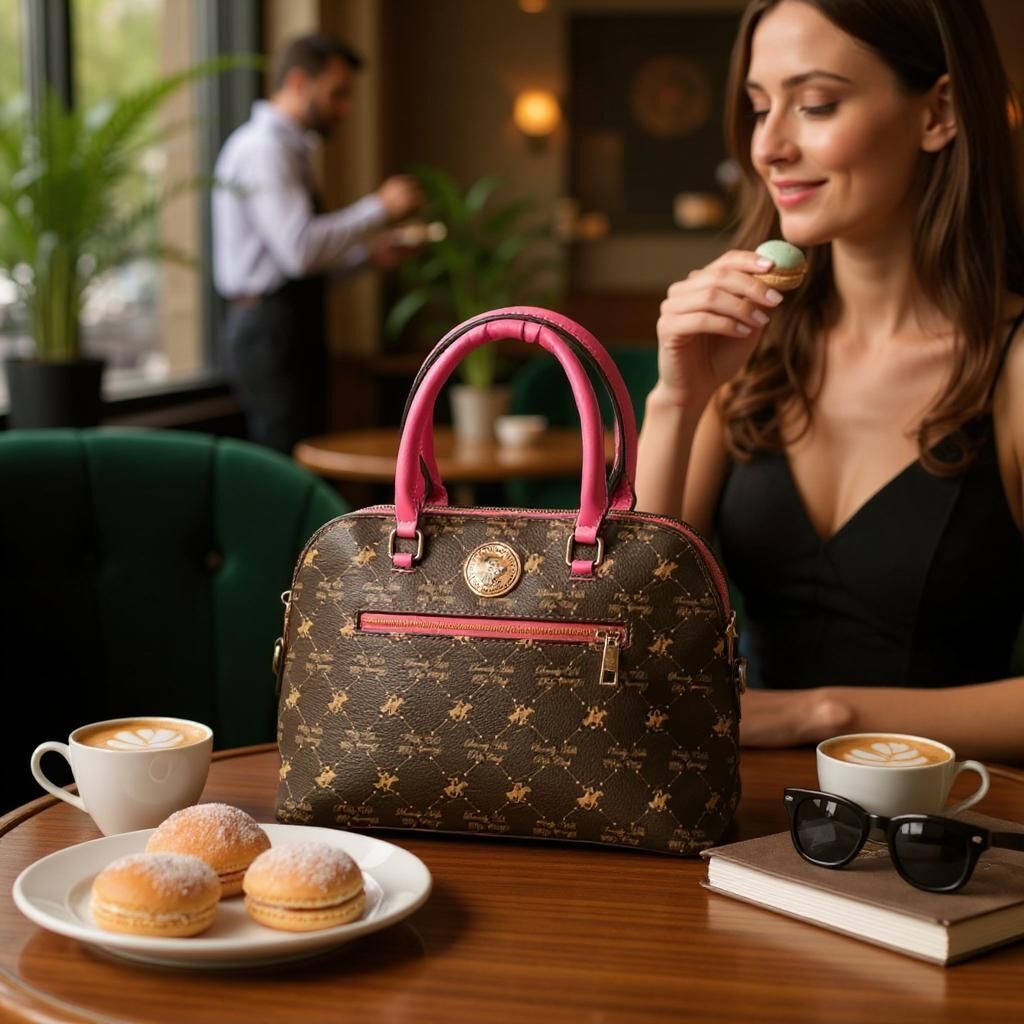 This crossbody bag from Beverly Hills Polo Club showcases a dark brown body adorned with the brand's signature repetitive logo pattern and contrasting pink handles. A prominent circular emblem on the front identifies it as a genuine Beverly Hills Polo Club product. With a zippered main compartment and potential additional pockets, this bag is crafted from synthetic materials like vegan leather or polyvinyl leather.