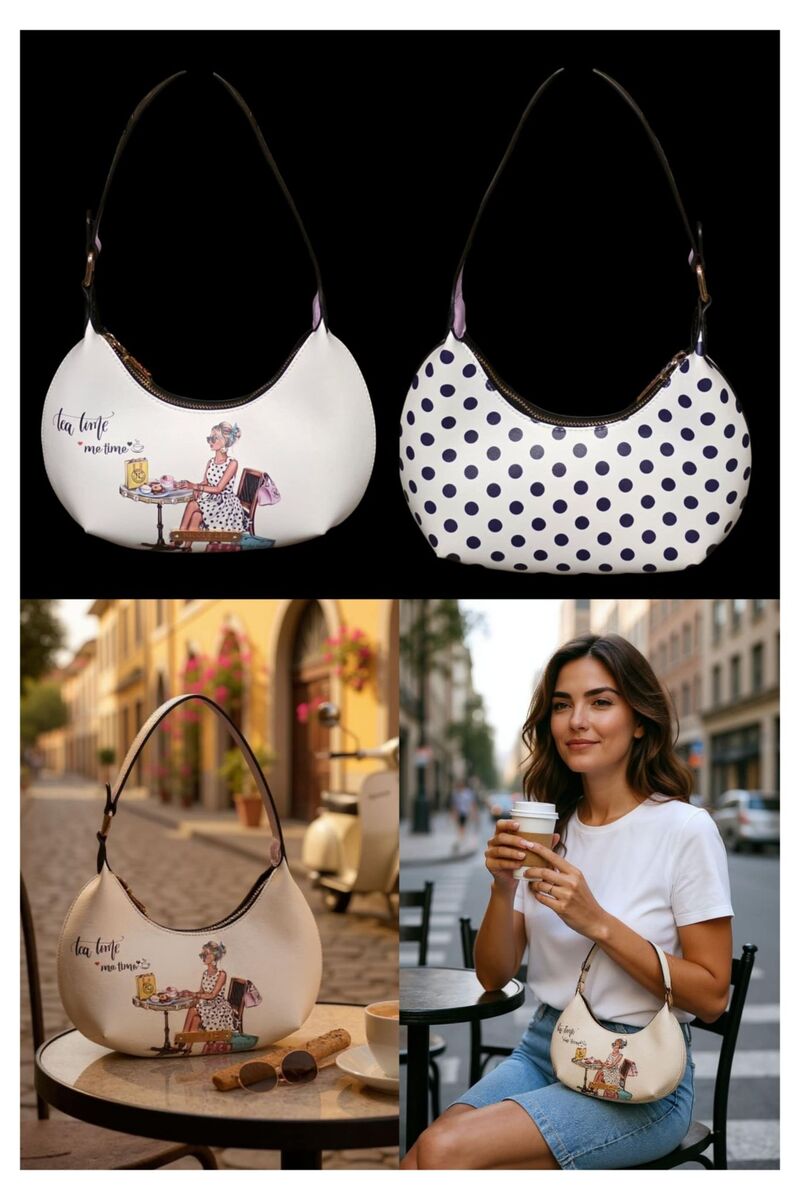"Nicole Lee"...... "Croissant Bag", also known as a crescent or half-moon shaped shoulder/crossbody bag, with the "Tea Time Me Time" illustration and the back with a playful polka-dot pattern.