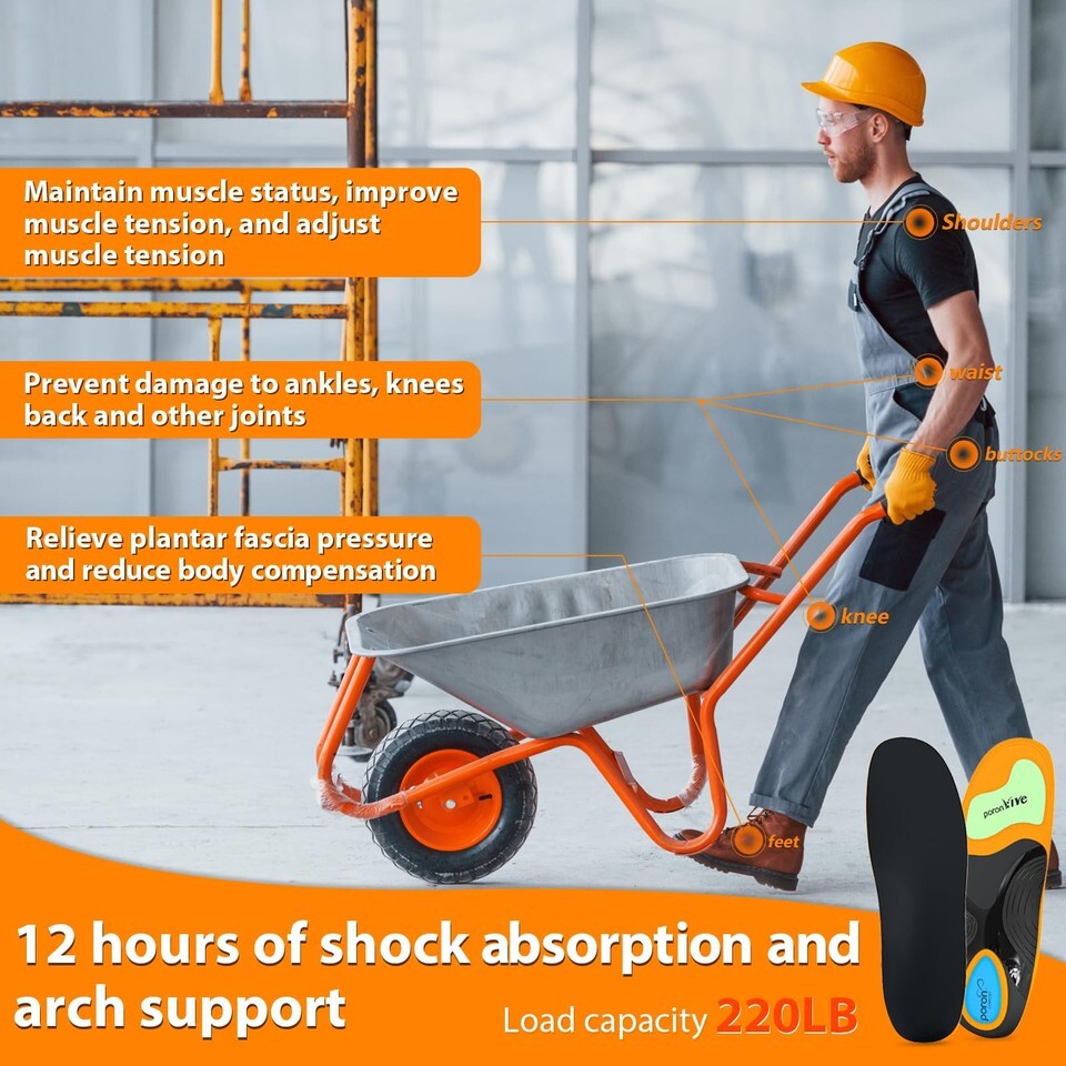 ?HEAVY DUTY SUPPORT INSOLES?: The Orthotic Shoe Inserts for Men Women designed for over 220lbs,Tests show that compared with high heel comfort pads, PORON high-performance materials have lower deceleration capabilities, thereby providing greater impact absorption performance. Thinner and lighter, it provides greater impact absorption.