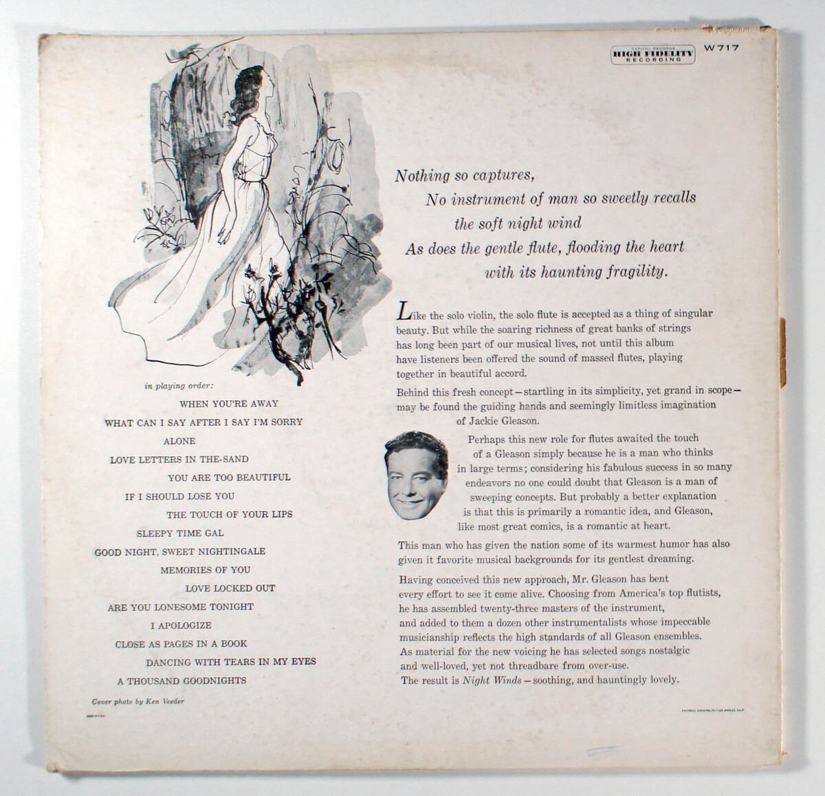 Night Winds, a mood music album by Jackie Gleason, features lush orchestral arrangements of romantic standards that exemplify his easy-listening style. The record includes evocative tracks like Love Letters in the Sand, Stella by Starlight, Black Coffee, and Body and Soul, designed to evoke a sense of nocturnal introspection and romance. Historically significant as one of over 20 albums Gleason produced between 1953 and 1969, it helped popularize space age pop and mood music, leveraging his fame as a television star to sell millions of records and influence the genre's development in the mid-20th century. The album achieved commercial success by reaching the top 10 on the Billboard charts, affirming Gleason's prowess beyond comedy into musical innovation. Its atmospheric soundscapes contributed to his enduring legacy in lounge and exotica music.