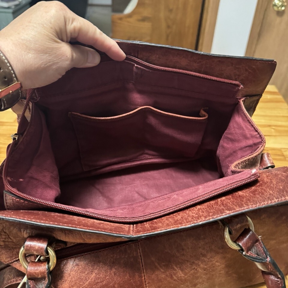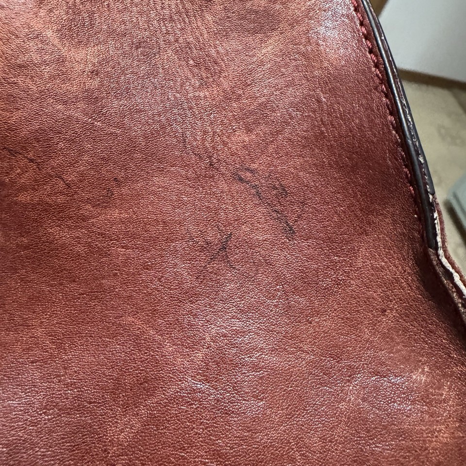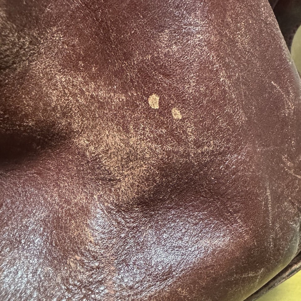 CONDITION: leather is worn and has fading, some ink marks and a few spots (see photos for some examples), last photo shows an small area where fabric has rubbed off (when zipper is shut it does not show), expect wear throughout. Still functions perfectly and has a great broken in look.