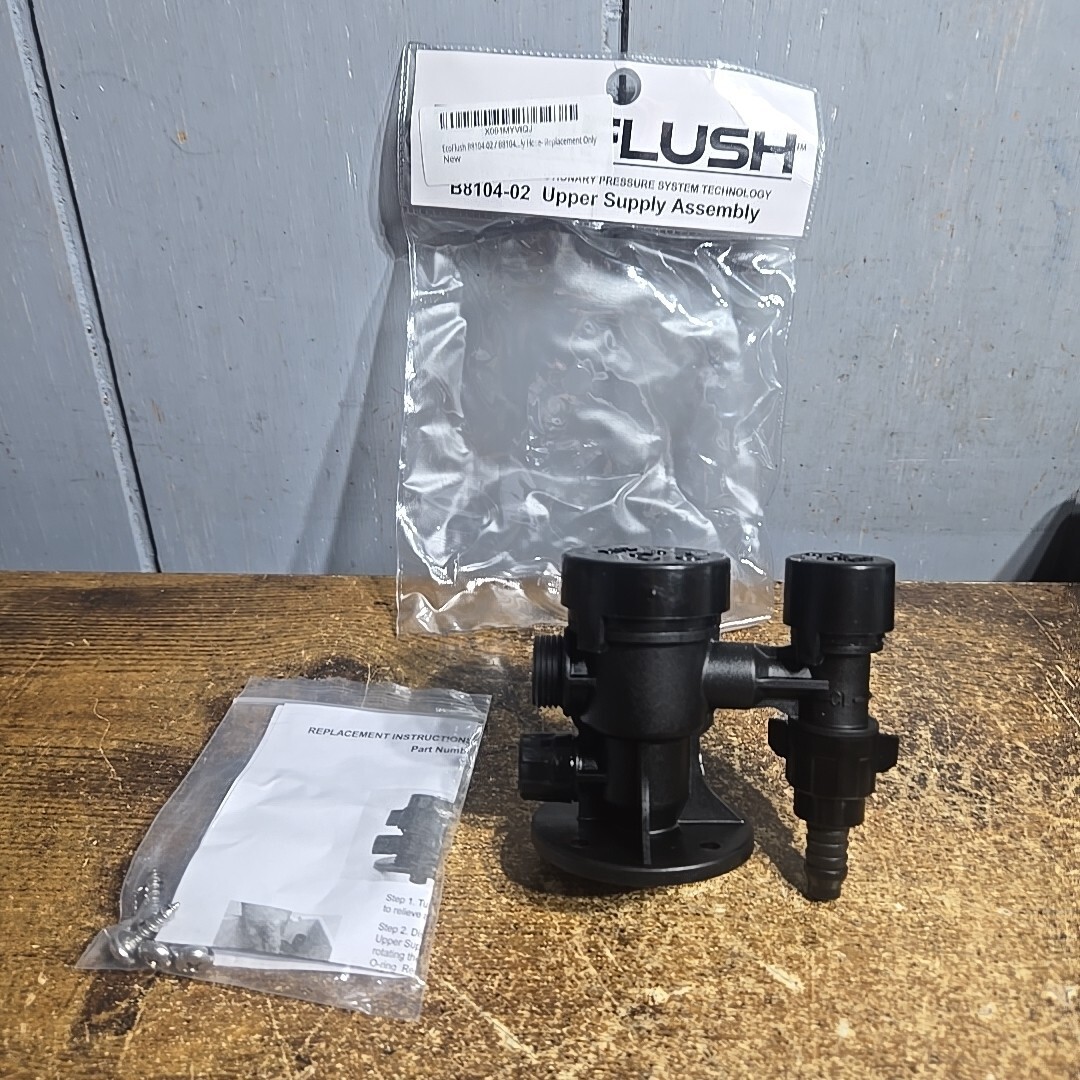 The ECOFLUSH Plastic Upper Supply Assembly B8104-02 is a flush valve designed for pressure-assisted flushing in toilets. This black assembly is suitable for use in bathroom settings, specifically for toilet fixtures. With the ECOFLUSH brand known for quality and environmentally friendly products, this supply assembly ensures efficient flushing performance while conserving water resources. Ideal for maintenance or upgrading existing toilet systems, this component helps in maintaining the functionality of pressure-assisted flushing technology.