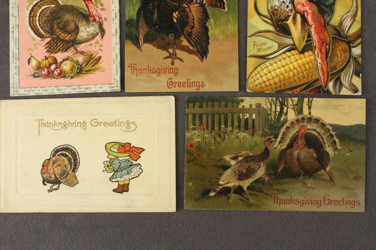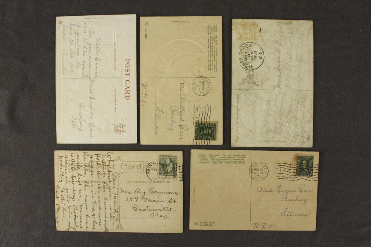 Vintage Postcard lot 1) THANKSGIVING JOYS 1909 Prize Winner Turkey Honey Brook PA. Postally used, but stamp missing. Light corner bumping. Message on the back. 2)1908 Thanksgiving Greetings 3) not postally used 4) 1908 Belleville IL 5) 1917 Illustrated.