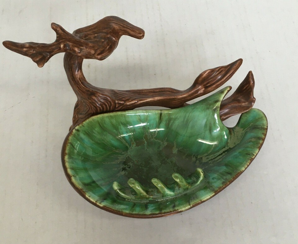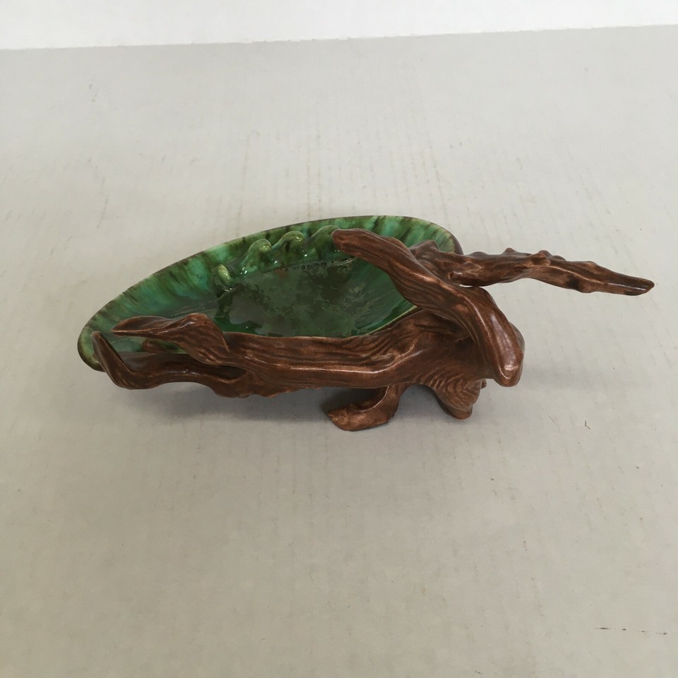vintage ceramic glazed mcm look ashtray driftwood look brown green color combo