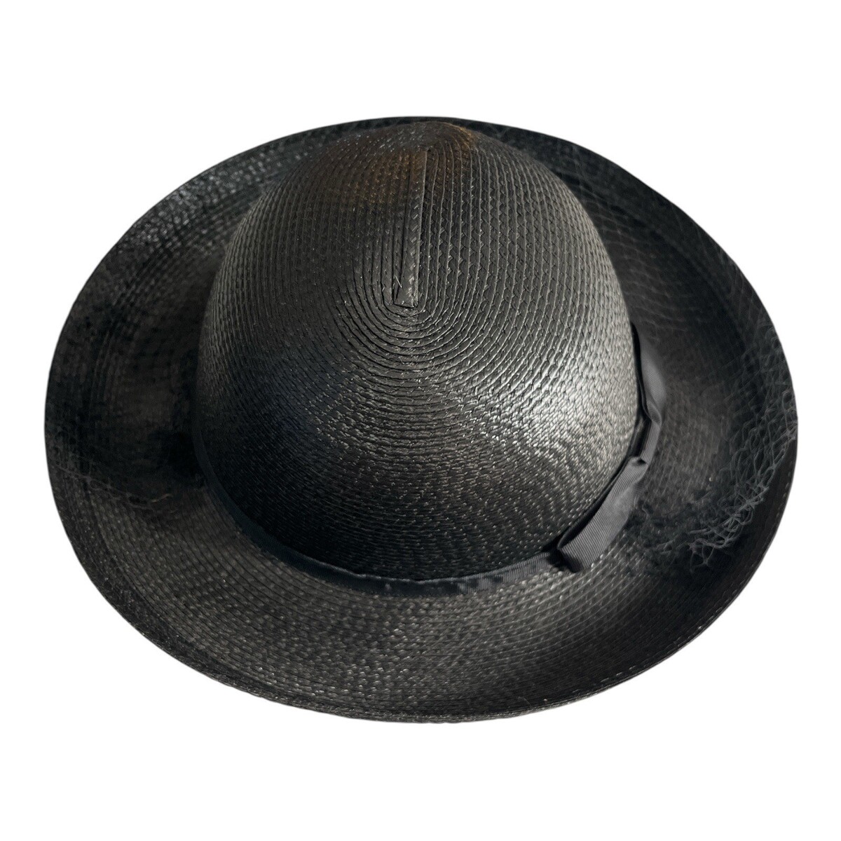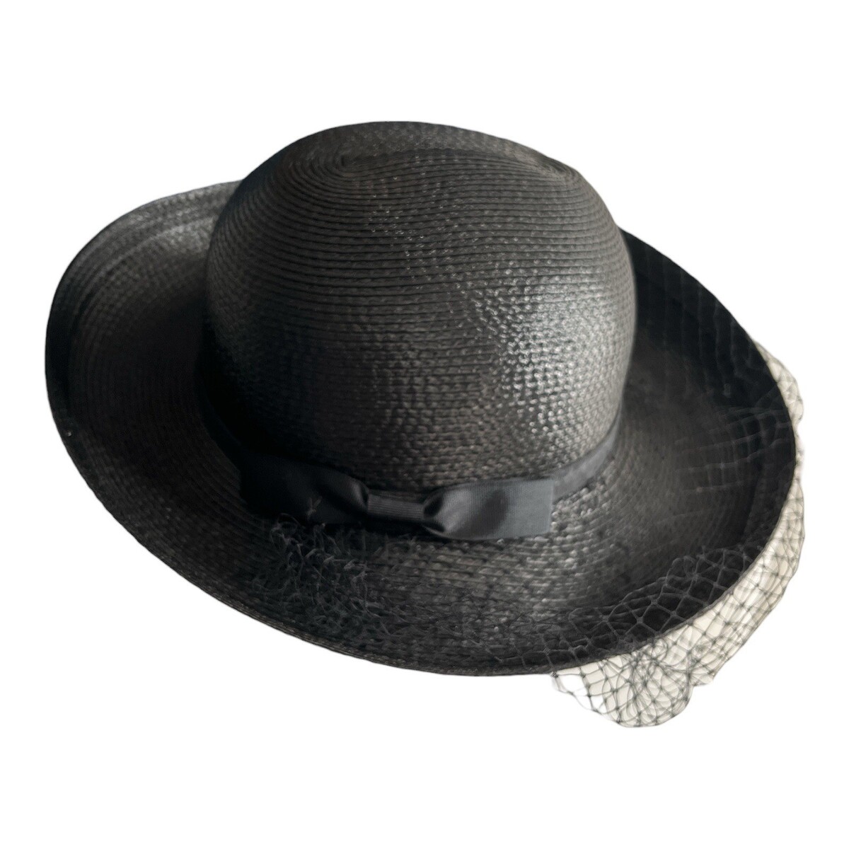 Vintage 1960s?1970s Black Woven Straw Hat with Veil Bow Trim Made in Taiwan R.O.C. 13x7