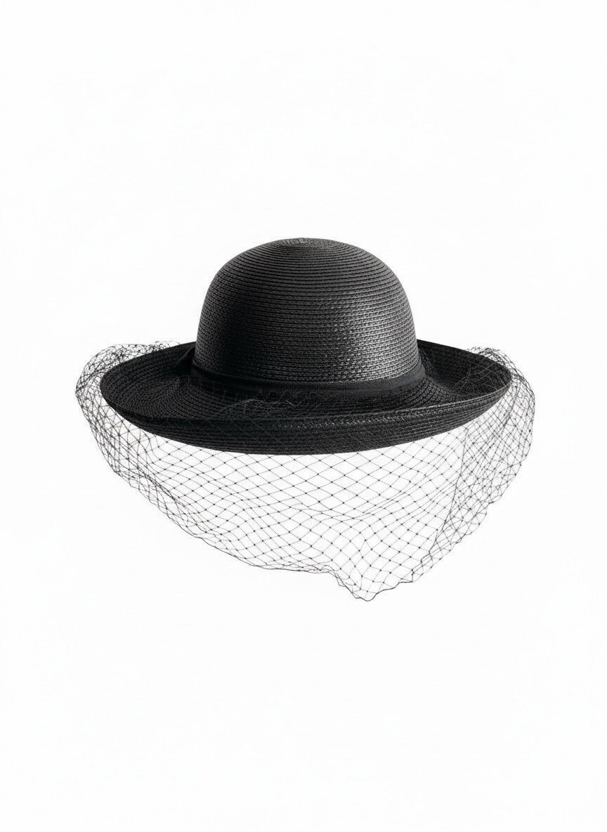 Vintage 1960s?1970s black woven straw-style hat featuring a classic short brim, matching ribbon bow, and attached net veil. Made in Taiwan R.O.C. from lightweight polypropylene. Elegant mid-century inspired styling suitable for dressy occasions, church, or costume wear.