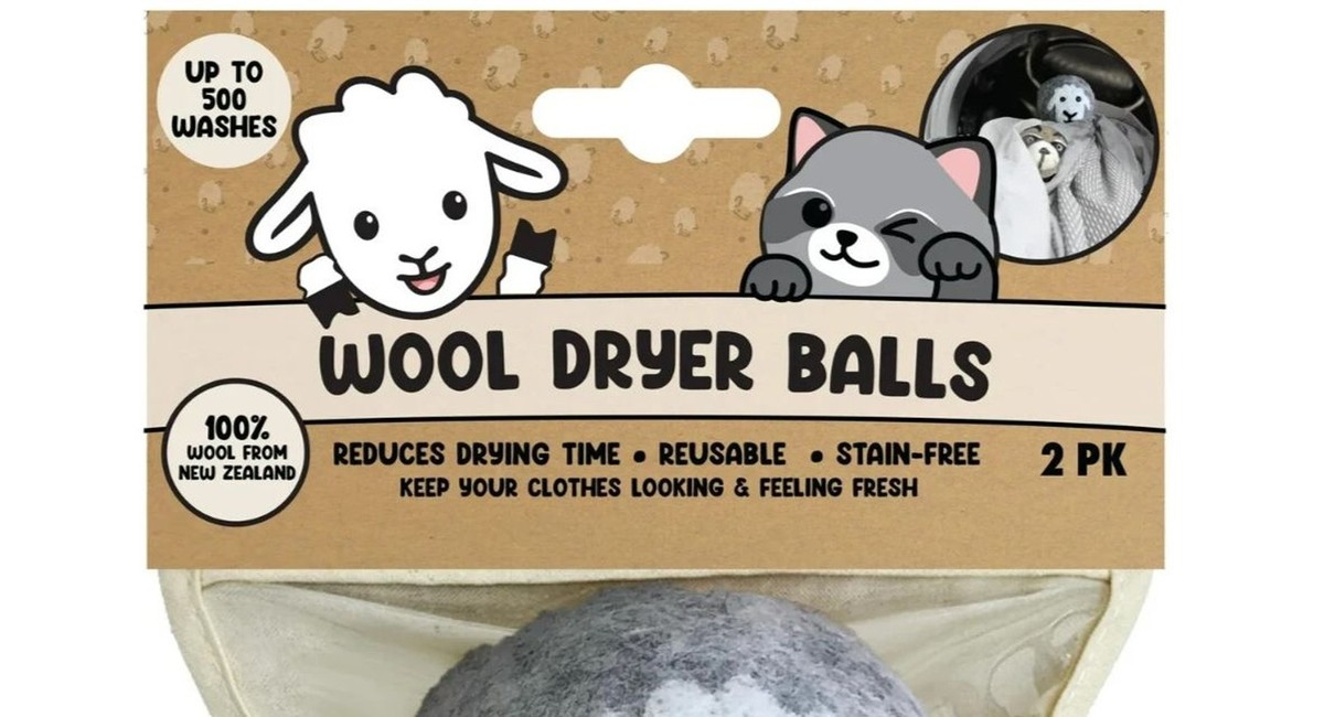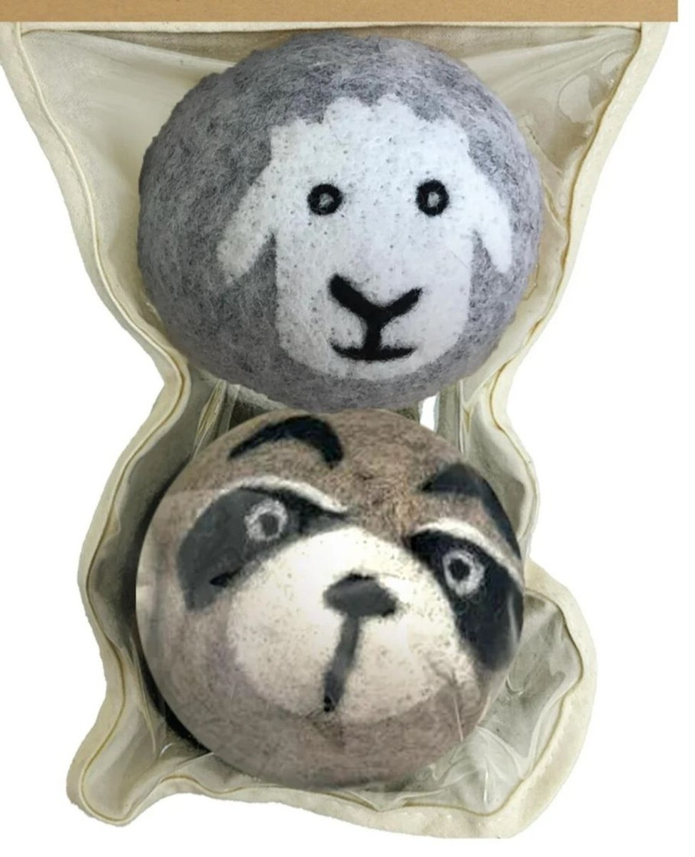 Evriholder New Zealand wood dryer balls featuring a sheep and a raccoon.