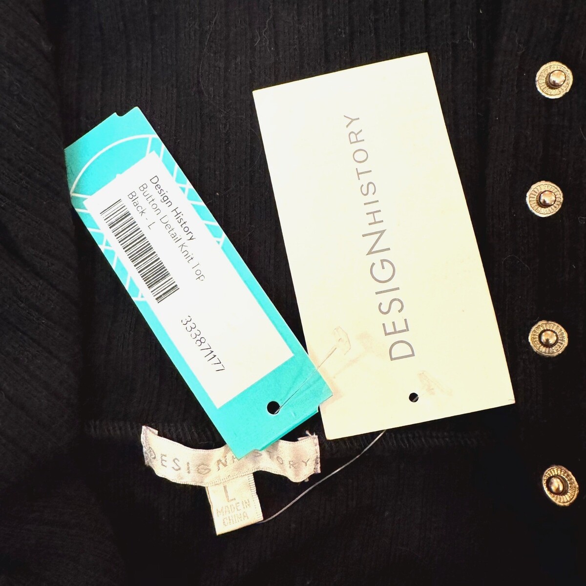 Design History NWT Black Knit Turtleneck Sweater L – Gold Btn Detail Long Sleeve