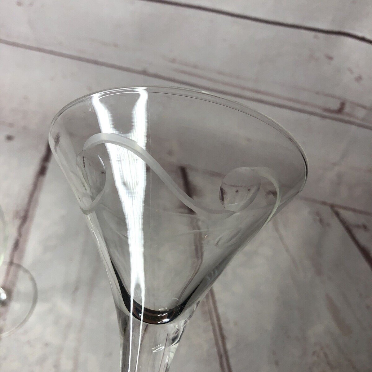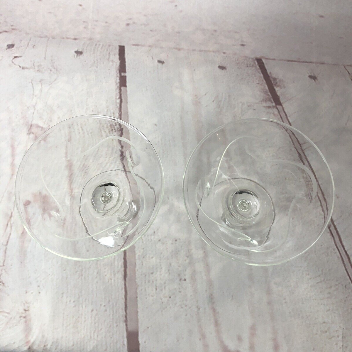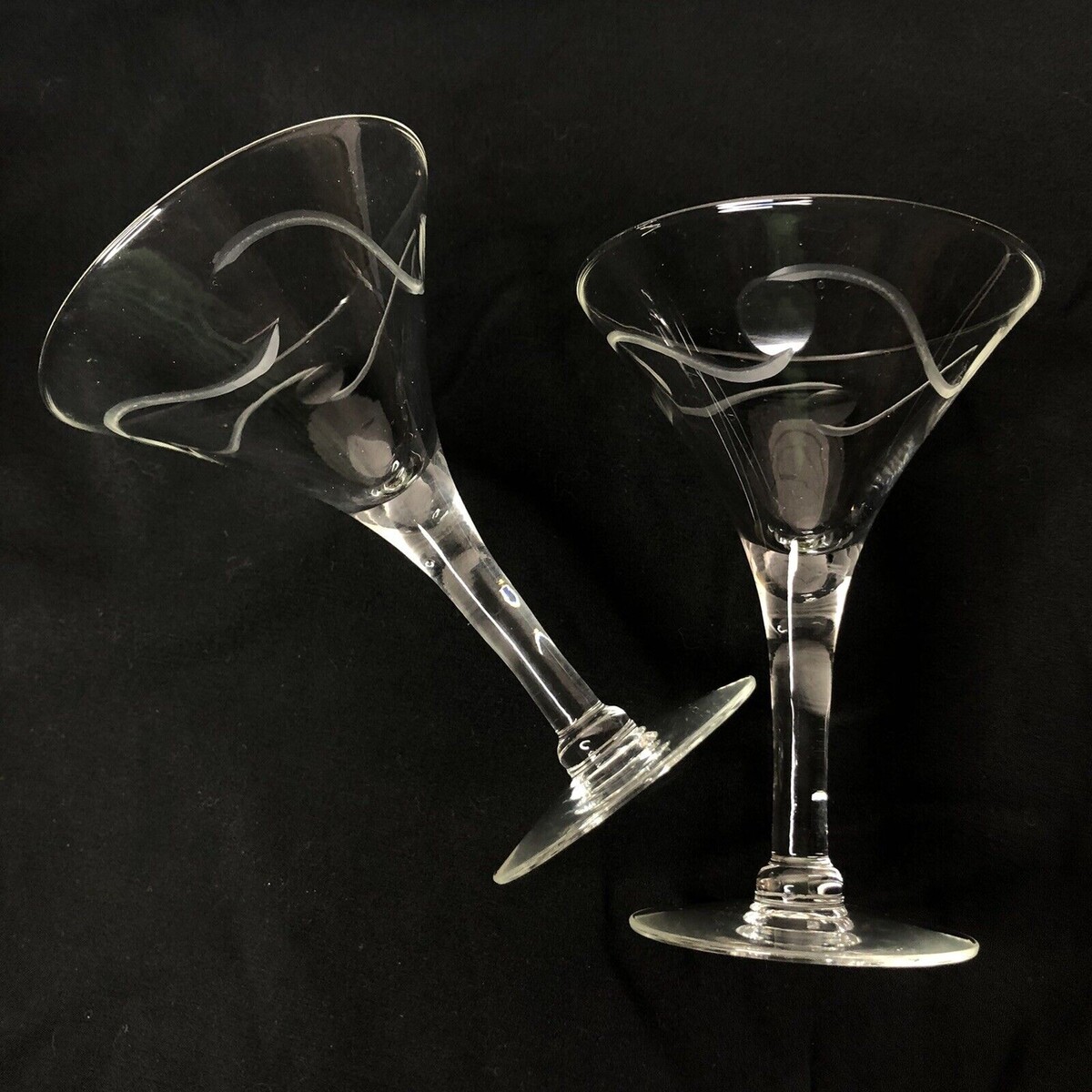 2 Etched Glass Martini Glasses Swirl Dot Dimples Cocktail Barware Stemware Pair