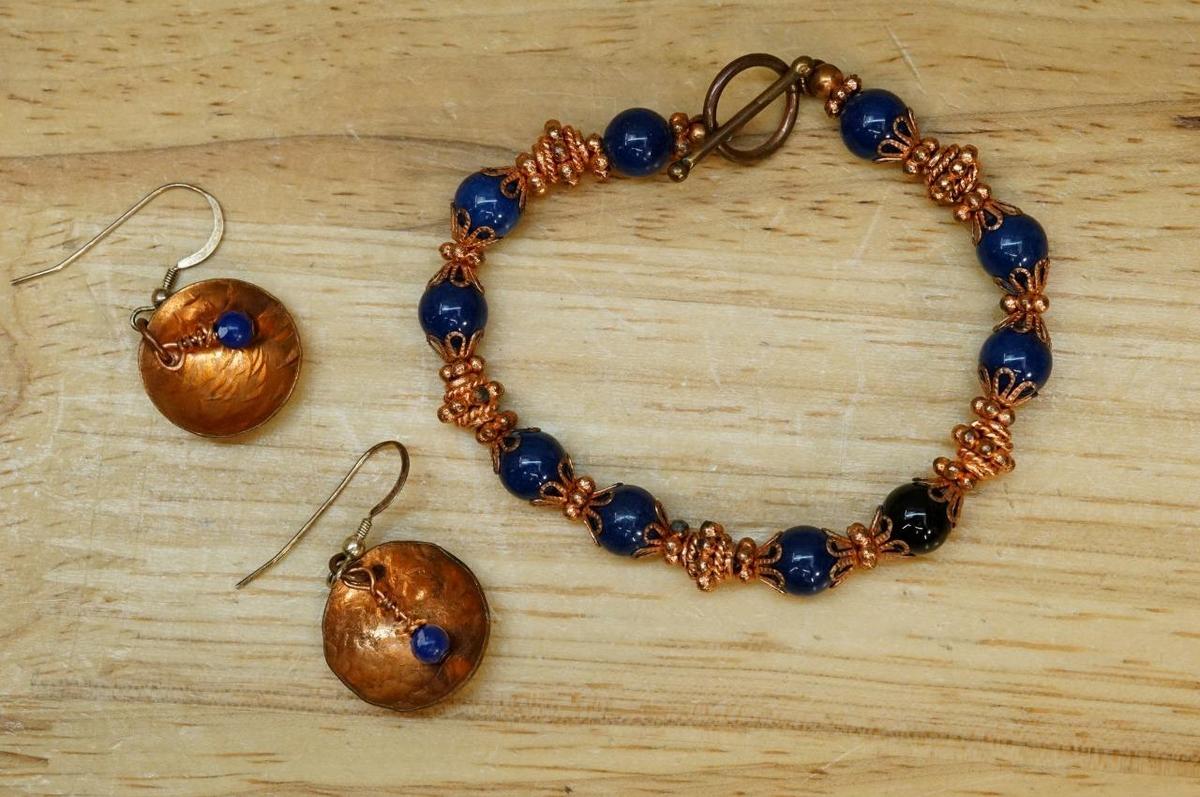Frilli Jewelry Italy Lapis Onyx Bead Copper Wirework Filigree Bracelet Earrings. Bracelet is 7.5" long set with 9 lapis beads and one black onyx bead. Toggle clasp. The earrings are pierced in style, accented with a lapis bead, copper body and sterling silver ear wires. 3/4" across the hand hamered dome disc pendant.