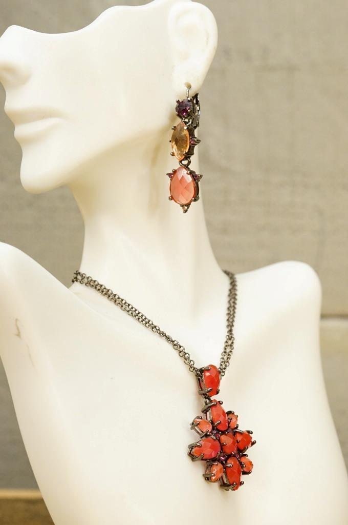 Estate Jewelry Joan Rivers Classic Collection Christmas Red Star Necklace Set. Pinkish red faceted rhinestones set in dark metal. 18" long necklace. Pendant is 1.75" long. Matching dangle earrings are pierced with a 2" drop.