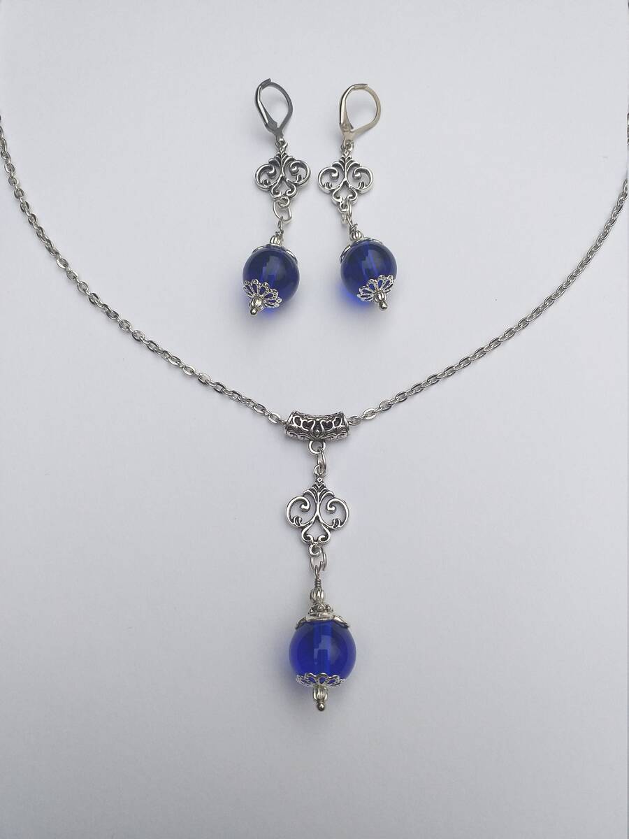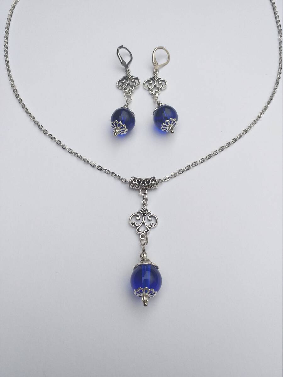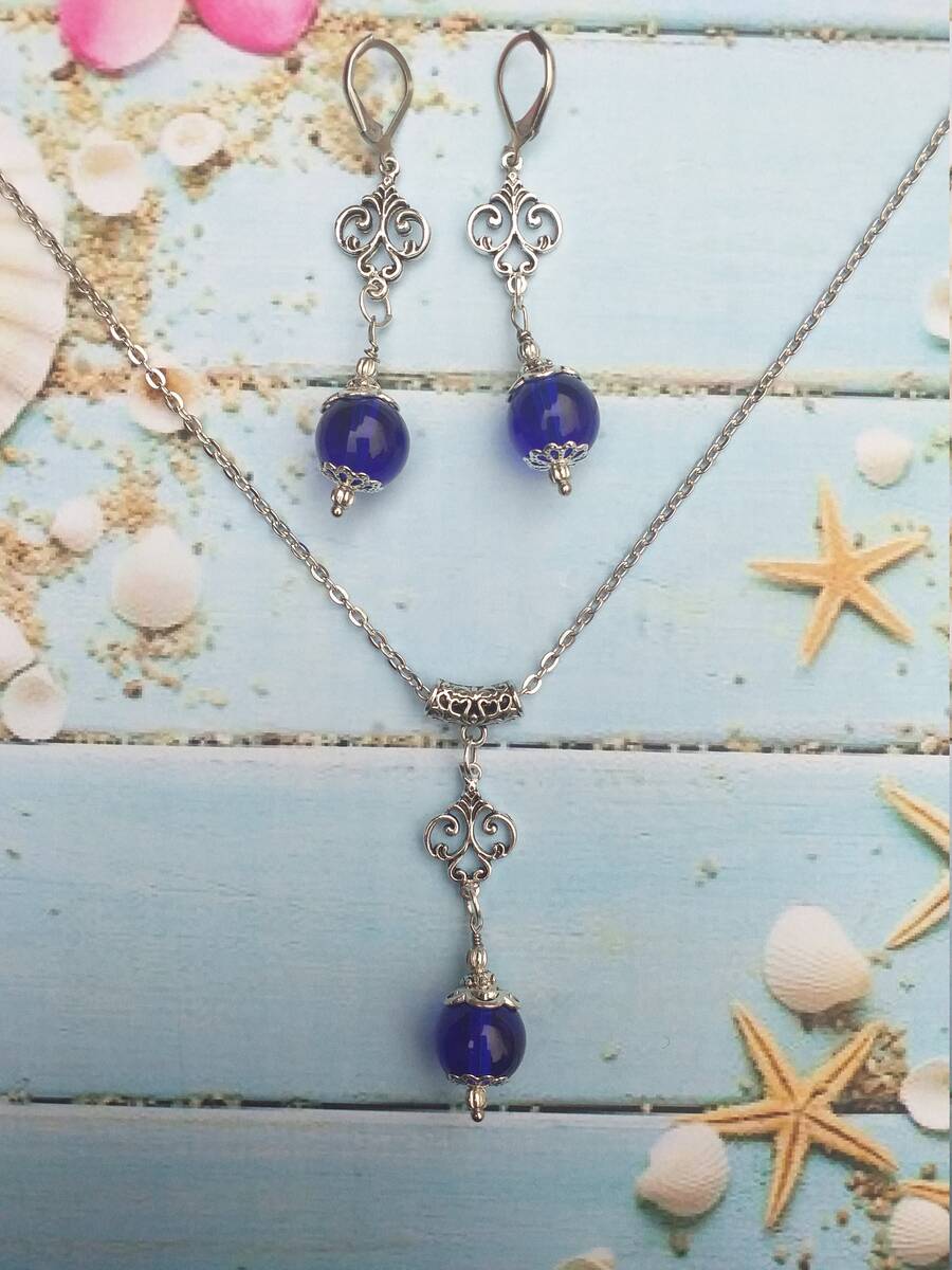 Beautiful Set of silver-tone Antique style Cobalt Blue necklace and earrings. Silver tone pendant Victorian style necklace and earrings. Boho necklace. Bohemian necklace and earrings. Romantic necklace and earrings. Beautiful necklace with same style earrings with Royal blue Murano glass handmade beads.