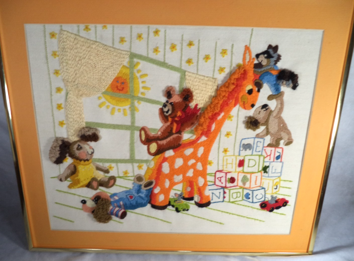 Sunset Nursery Crewel Large 1980 Finished Framed Animals Blocks Sun 18" x 20"