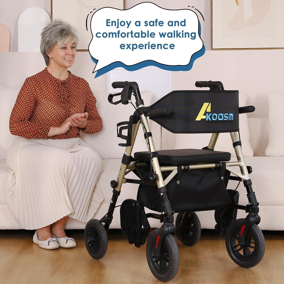 Akoasm Foldable Rollator Walker for Seniors w Seat, Lightweight 2 In 1 Champagne