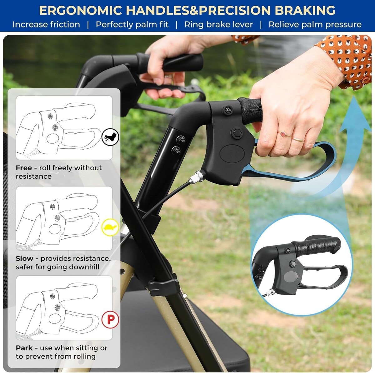 ?3-MODE BRAKES ALL-ROUND SAFETY?3 in 1 Braking System (Free/Slow/Stop) effectively improves the safety of use on slopes and crowded areas. Even for users with limited strength, AKOASM rollator walker with seat can be easily operated. Safety fastening straps on the waist and foot rest further enhance stability. This reflects AKOASM's commitment to providing reliable wheelchairs for adults
