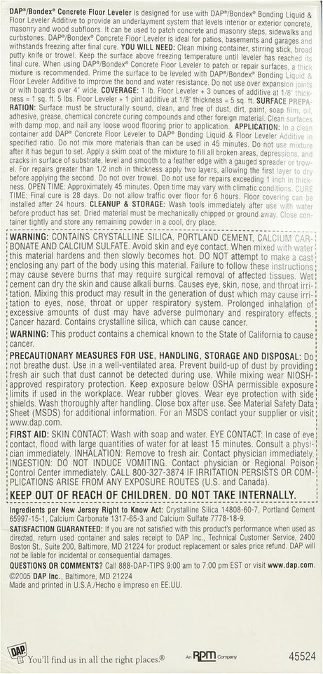 Dap Bondex Concrete Floor Leveler is a Portland cement?based, polymer-modified underlayment designed to smooth and flatten interior concrete, masonry, and plywood subfloors prior to resilient, ceramic, or hardwood flooring installation. This self-leveling (with trowel assist) compound fills voids up to 1 inch deep, corrects minor slope irregularities, and creates a uniform surface for optimal adhesion and wear resistance. The gray formulation matches standard concrete for seamless visual integration, while added polymers enhance flexibility and reduce shrinkage cracking. Mixes easily with water to a pourable or trowelable consistency, sets in 3 hours, and is ready for light foot traffic in 24 hours. Ideal for basements, garages, commercial tenant improvements, and renovation prep?especially where vinyl sheet goods, LVT, or tile require a flat, stable substrate per ASTM F710 standards.