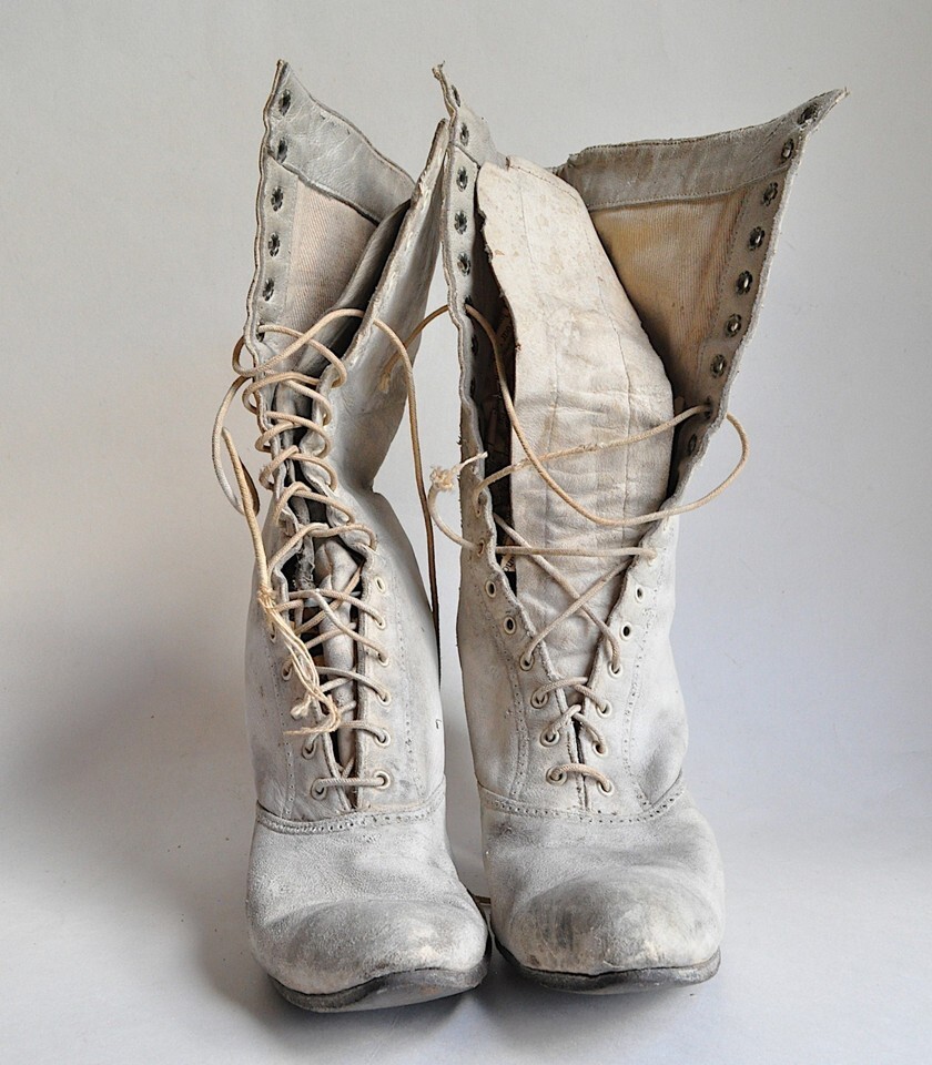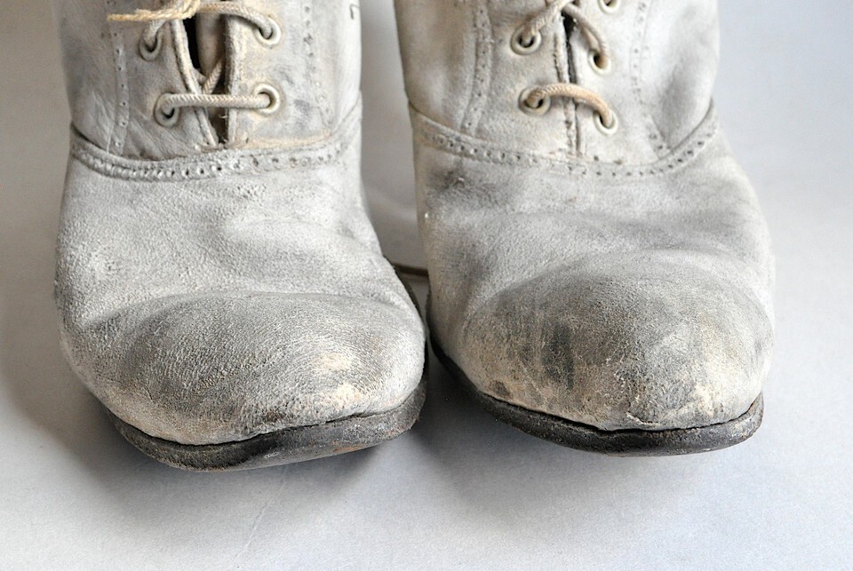 Thrashed pair of antique lace-up boots, for study or display (or whatever creative idea you come up with.) They feel like suede, but are so caked with white shoe polish I'm not sure that's right. What they probably are is kid. 10 inches high overall. Heels are almost 3" tall at the very back. 2 5/8" across the sole at the ball of the foot. They look to be around a six or seven, but I wouldn't recommend them for wear. They are from the Edwardian era, give or take a decade. Just the tiniest bit of brogueing up and around the shaft and across the vamp. Lined with cotton twill and stuffed long ago with newspaper, which I will leave in place. The tongue of the right shoe is chewed at the top, you can see part (but not all!) of what's missing in the very last photo.