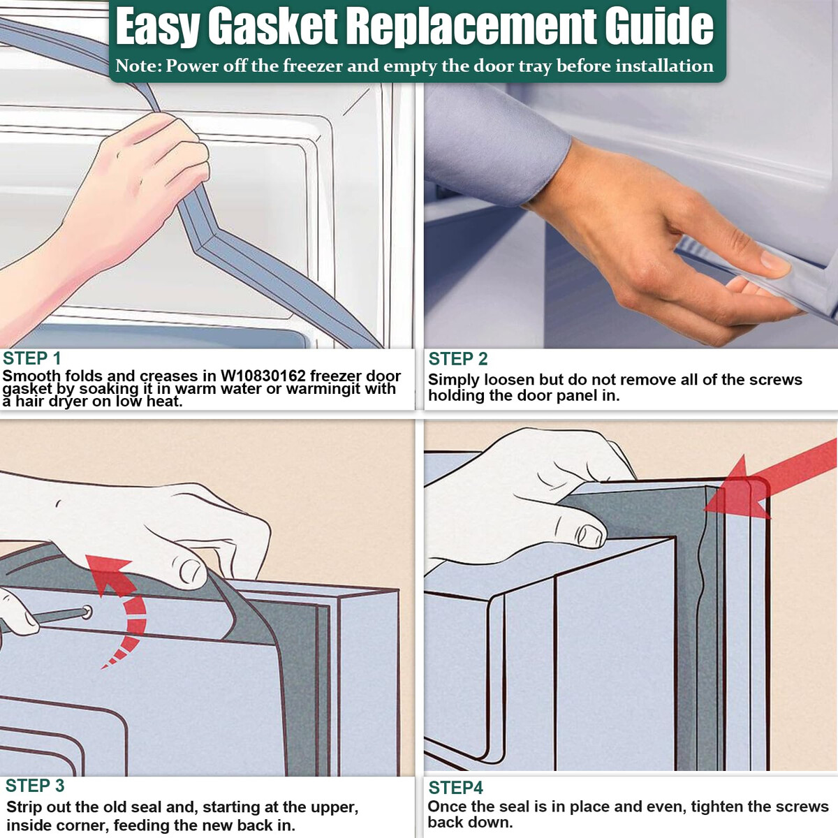 2?? Remove the Old Gasket: Unplug the refrigerator, then gently pull out the old seal starting from a corner.