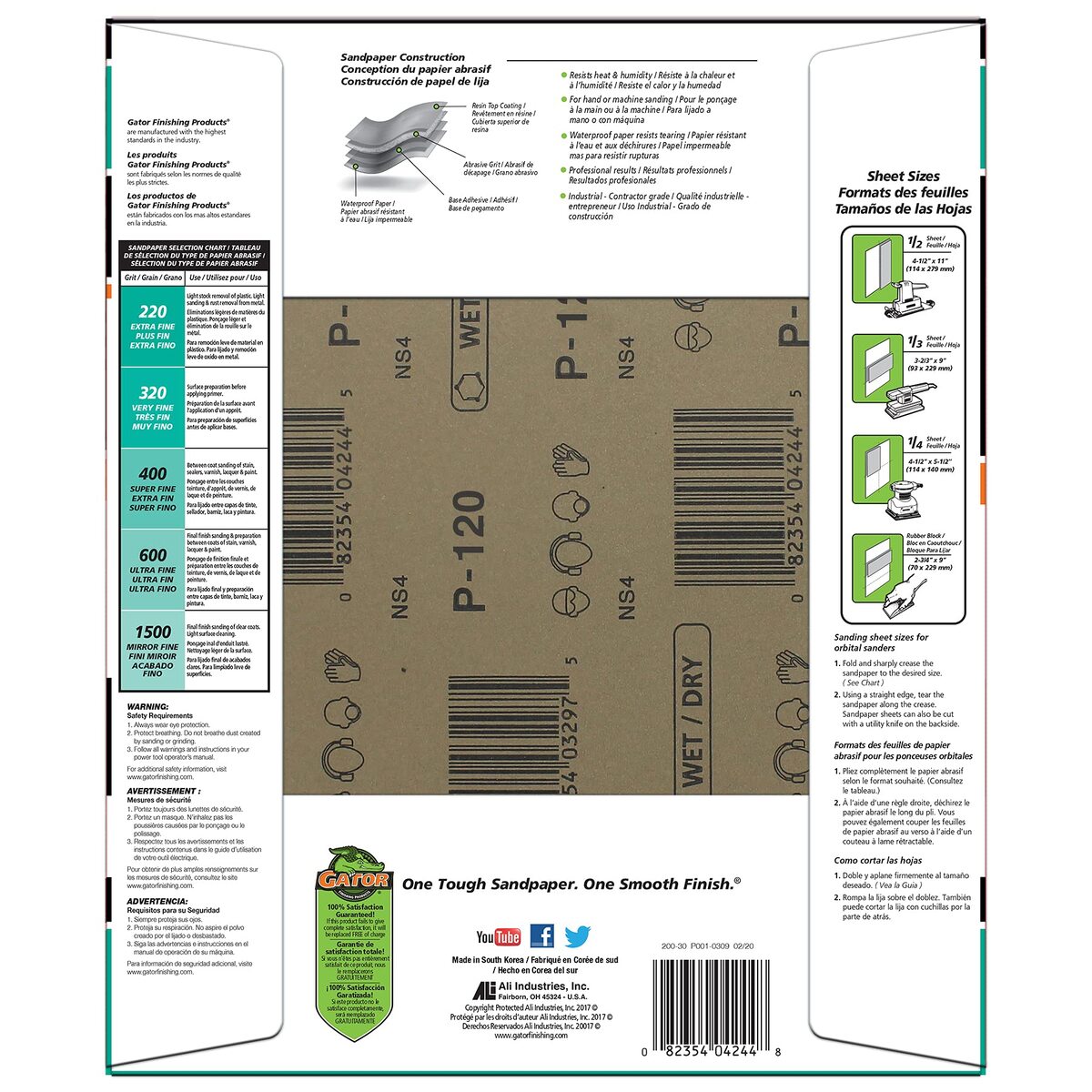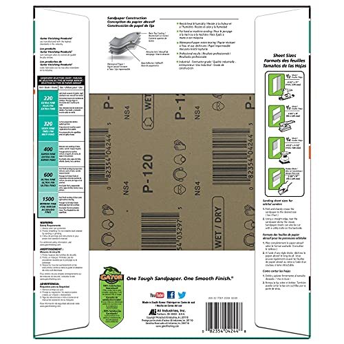 Product description: The Gator 9" x 11" Waterproof Sanding Sheets, offered by ALI Industries, are designed for both wet and dry sanding of metal surfaces and between coats of finishes. These sanding sheets are 2500 grit, made of aluminum oxide, and come in a pack of 1 unit, with 25 sheets in total. The backing type is film, providing a waterproof synthetic material for durability and longevity. The dimensions of each sheet are 9.25 inches in width and 11.25 inches in length. These sanding sheets are compatible with metal materials and are ideal for mirror fine sanding. The model number for this product is 4236.