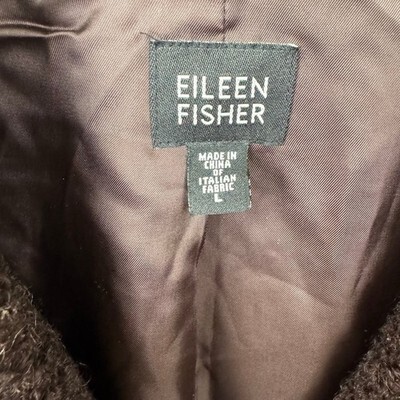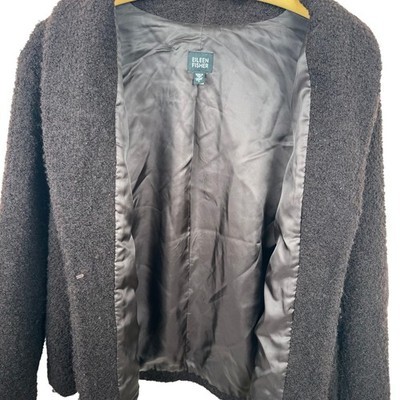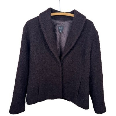 Keywords: Eileen Fisher jacket, women's blazer, wool blend jacket, textured outerwear, shawl collar coat, designer jacket, luxury fashion, minimalist style, classic outerwear, brown jacket, size L jacket, Italian fabric, winter fashion, fall wardrobe