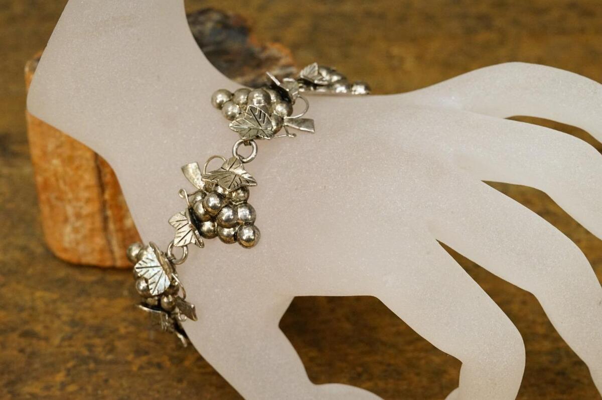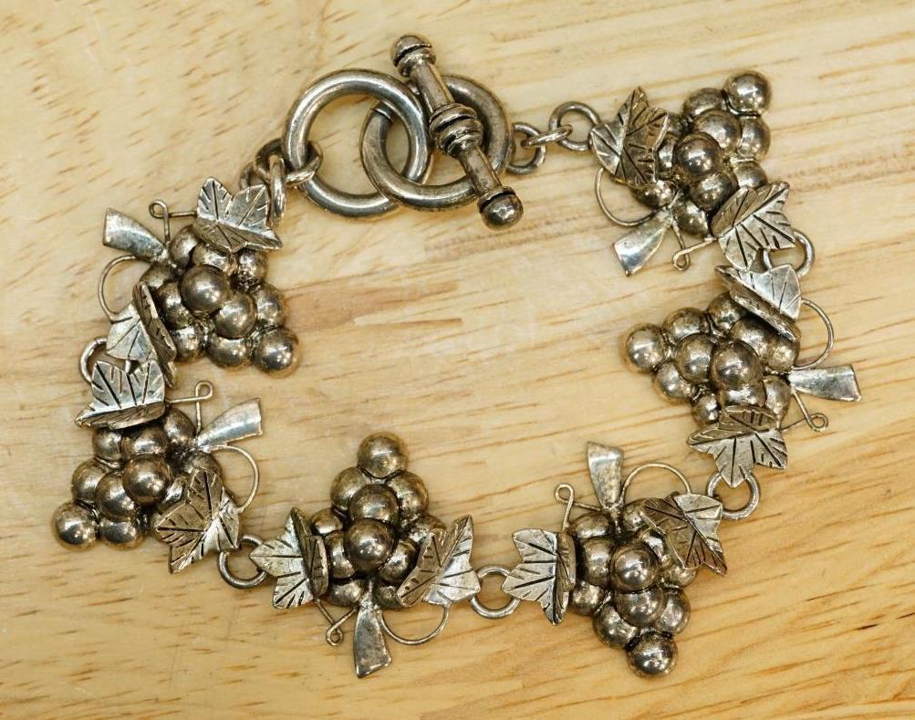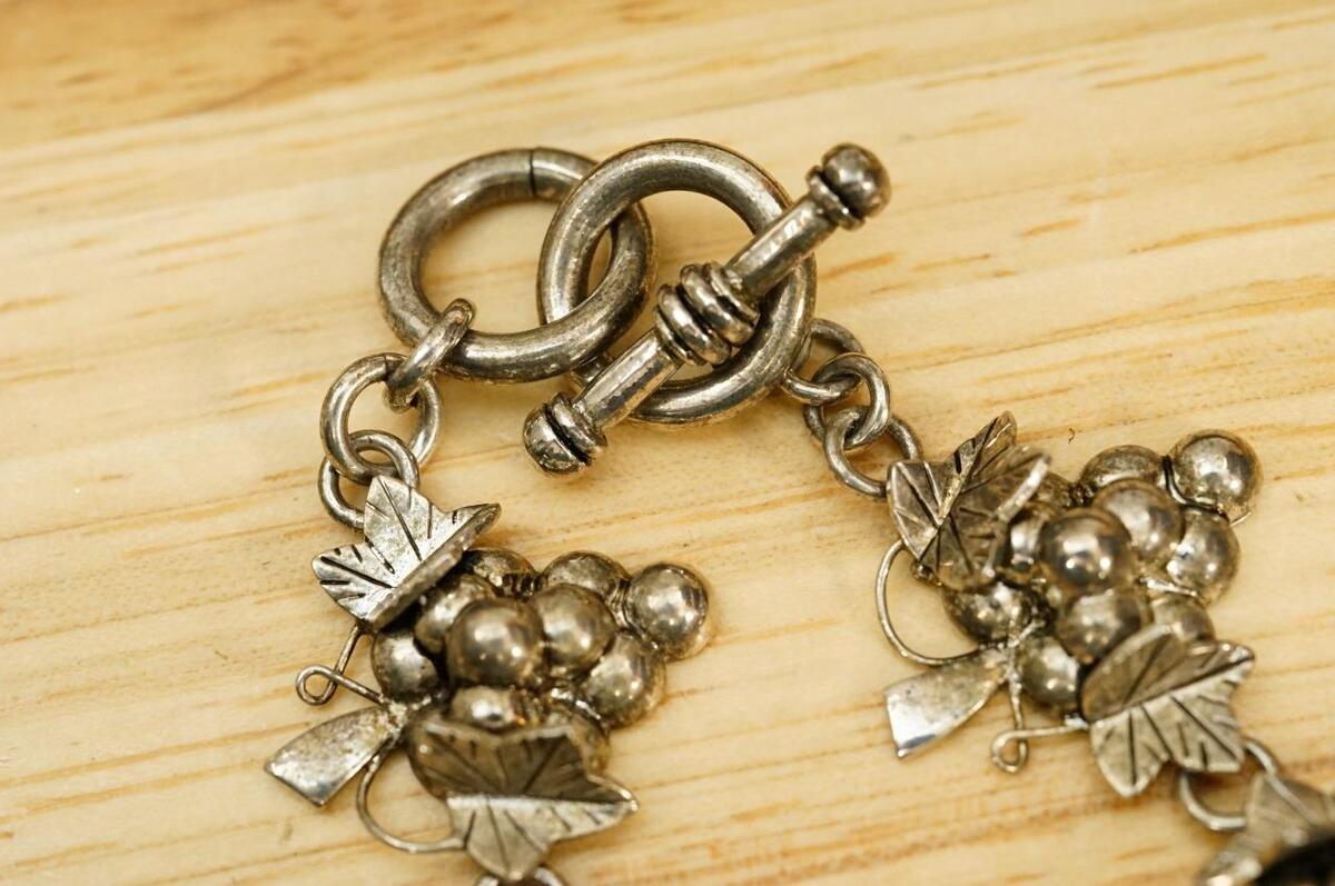 Vintage Best Jewelry Silverplate Metal Wine Grape Cluster Leaf Link Bracelet 8" long with toggle clasp. silver plate over brass. 3D statement links. Great for your favorite wine lover. Clusters are 1-1/8" across. No smoke or pet odors.
