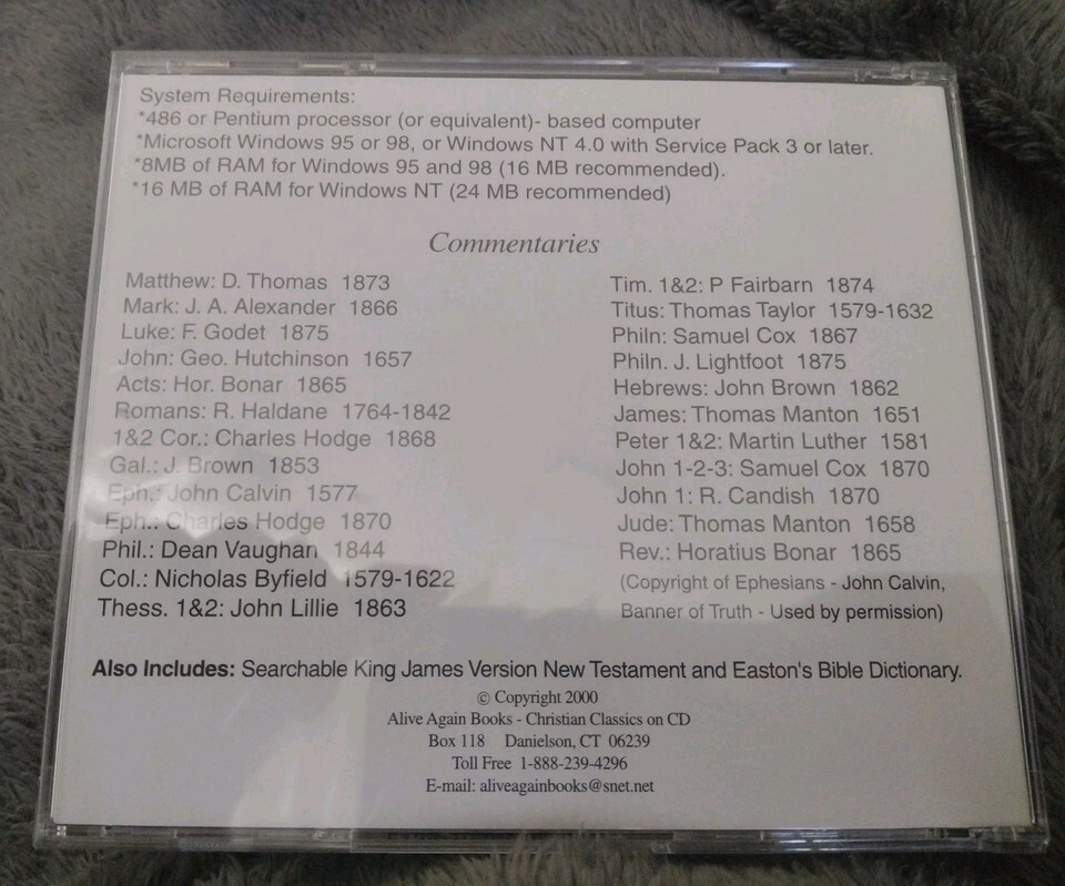 The Spurgeon Selection of New Testament Commentaries Vol 1 is a Christian commentary presented in CD format by Alive Again Books. This collection of Bible scriptures is specifically designed for use with Microsoft Windows 95 operating systems, making it easily accessible for readers looking to engage with in-depth commentary on the New Testament. With a focus on providing insights and interpretations, this product serves as a valuable resource for individuals seeking a deeper understanding of the biblical text.