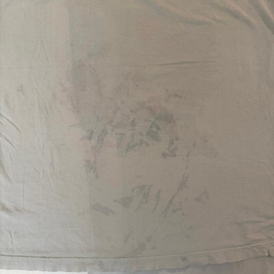 Condition: Fair. No holes or tears. Noticeable staining/discoloration on sleeve, chest, and lower back (see photos). Still fully wearable, offered at a bargain for the graphic and style.