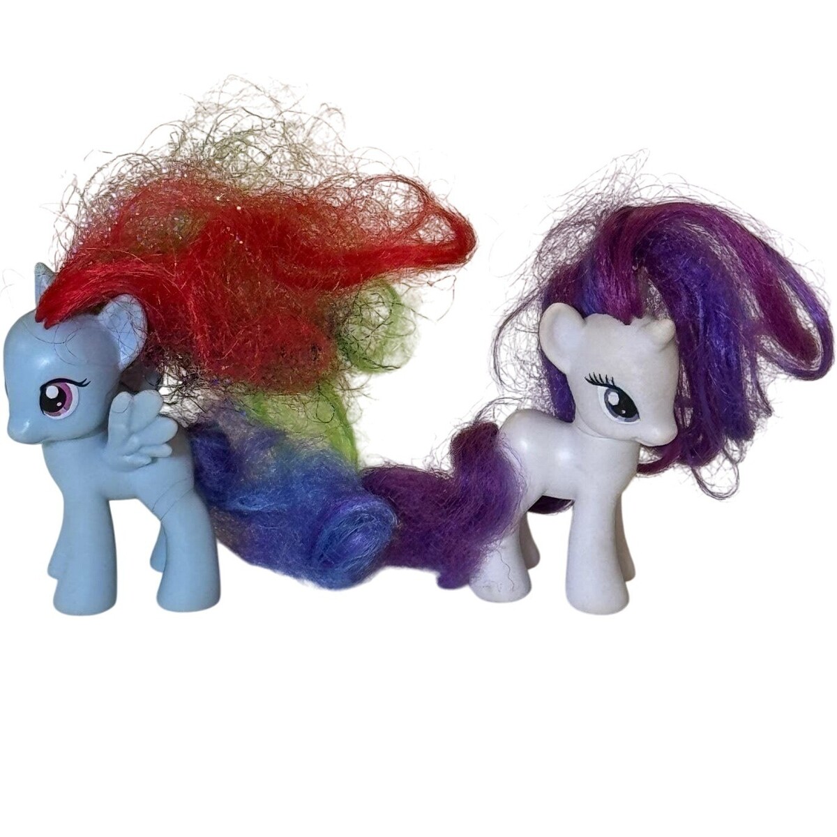 An original duo from Hasbro's My Little Pony: Friendship Is Magic 2010 launch ? Rainbow Dash and Rarity, two fan-favorite characters from the earliest G4 brushable line. Both stand around 3OE" tall with their signature cutie marks: Dash's lightning cloud and Rarity's diamond trio. Their vibrant rooted hair and classic eye detailing capture the charm of the show's first wave. Perfect for collectors restoring early G4 sets or fans looking for authentic originals from the Friendship Is Magic debut year.