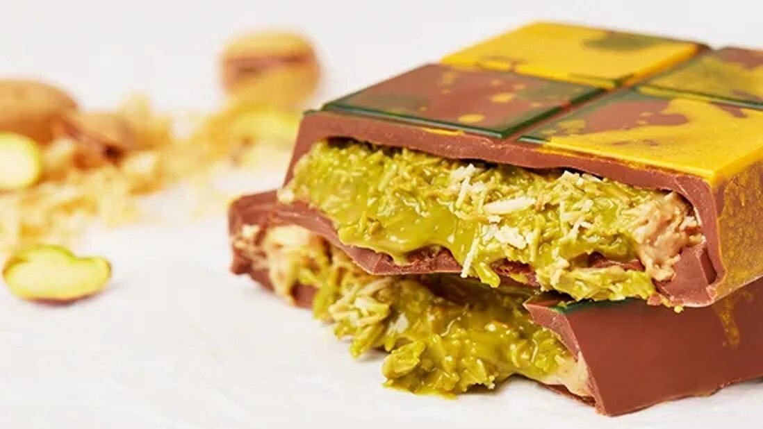Dubai chocolate is a milk chocolate bar filled with a sweet pistachio-tahini cream and kadayif (chopped filo pastry).[2] The consistency of the filling ranges from finely ground to a paste.[3] The creamy textures of the pistachio and tahini contrasts with the crunch of the kadayif.[2]