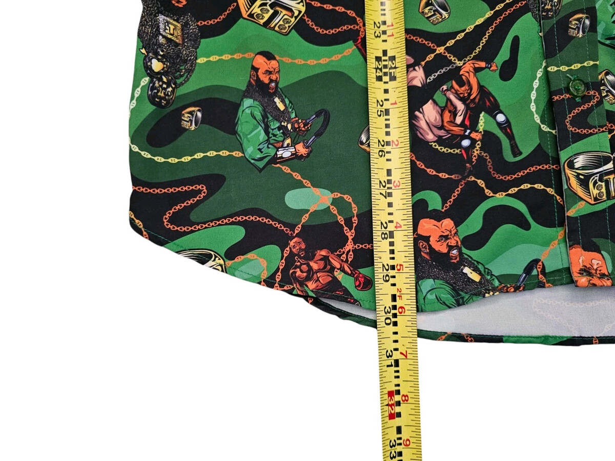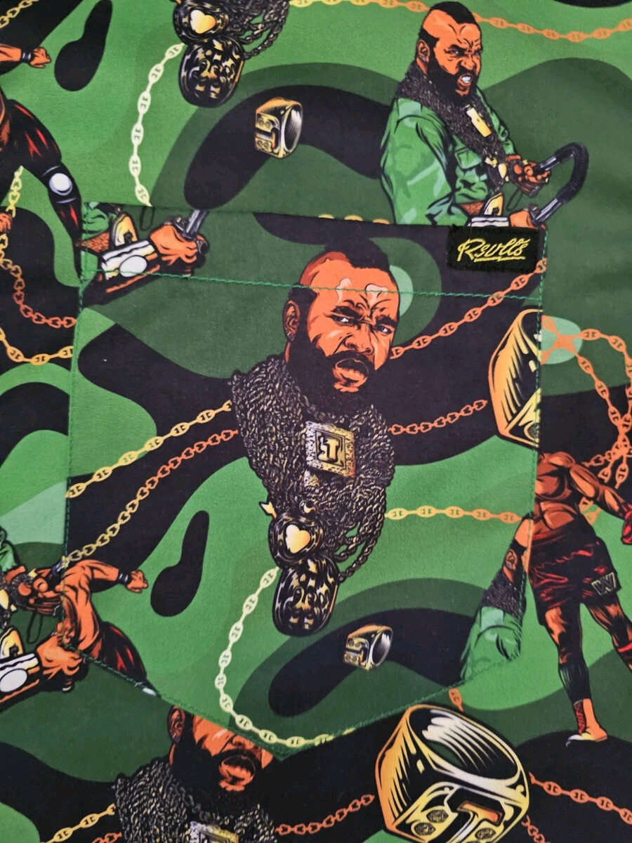 This RSVLTS WWE Mr. T "Pity The Fool" KUNUFLEX Gren Camo Short Sleeve Shirt in size Large features a collared neckline with a spread collar style. Made from a blend of polyester, viscose, and cotton fabric, this button-up shirt has a colorful AOP pattern with embroidered accents and a multicolor design. It is suitable for various occasions like travel, parties, casual outings, and workwear, making it a versatile piece for the summer, fall, and spring seasons. The shirt also includes features like easy care, pockets, and is designed for all seasons.