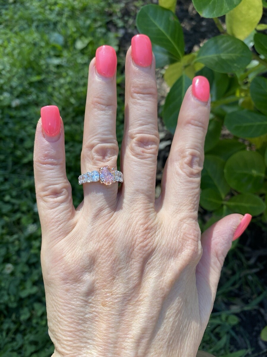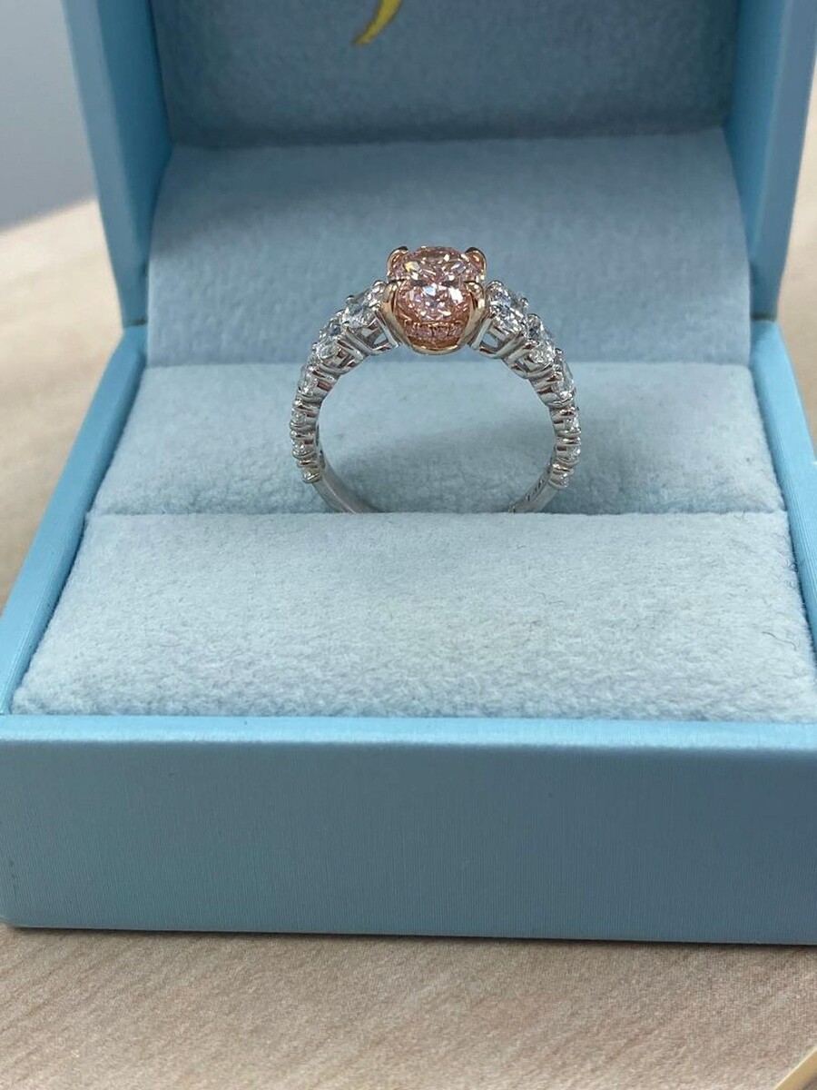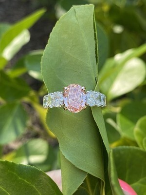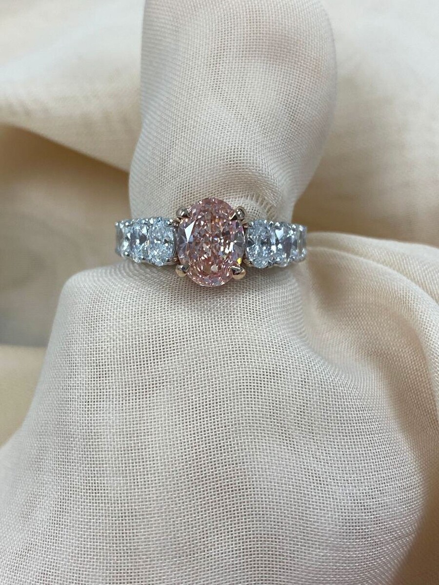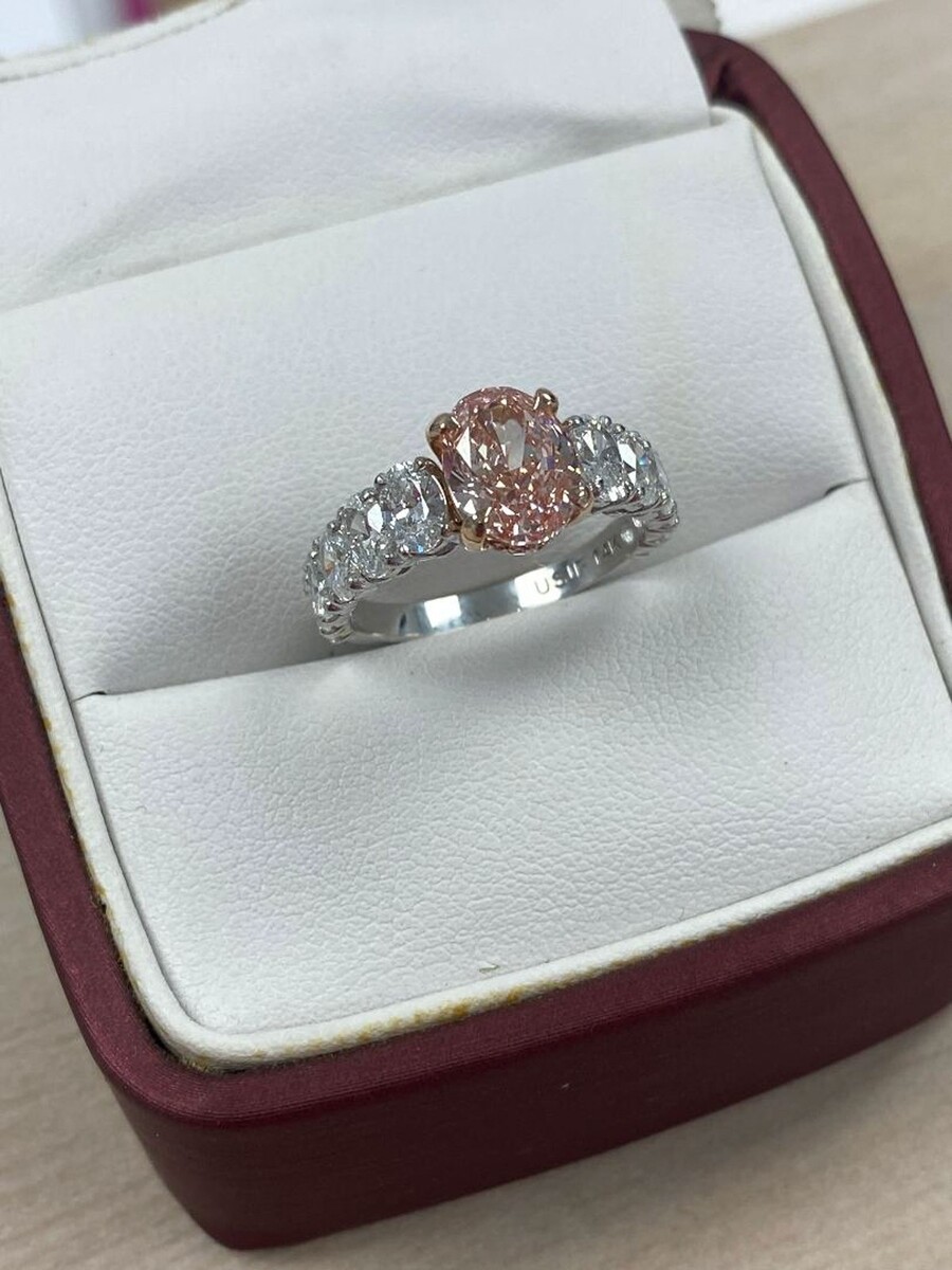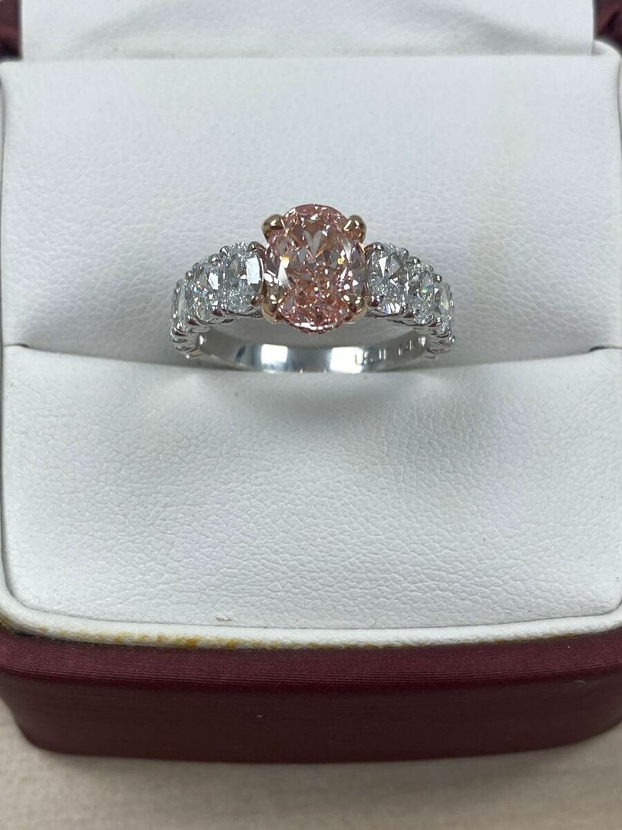 Dieser exquisite Verlobungsring verfügt über einen erstaunlichen 2,06 Karat ovalen, modifizierten, im Labor gezüchteten, leuchtend rosa Diamanten im Brillantschliff, der vom renommierten IGI zertifiziert ist. Die ovale Form des Diamanten ist wirklich einzigartig und lenkt die Aufmerksamkeit auf seine Brillanz, was ihn zu einem aufmerksamkeitsstarken Mittelpunkt macht. Als Erganzung zum Mittelstein sind 1,88 Karat runde Diamanten im Brillantschliff mit 1,88 Karat ovalen Diamanten im Brillantschliff an der Seite sorgfaltig in einem versteckten Heiligenschein und entlang des Bandes platziert, was dem Design ein neues Maß an Eleganz und Raffinesse verleiht. Das Gesamtkaratgewicht betragt 4,00 Unsere Produkte werden alle mit Qualitat und Sorgfalt von Hand im Herzen des Diamantenviertels in der