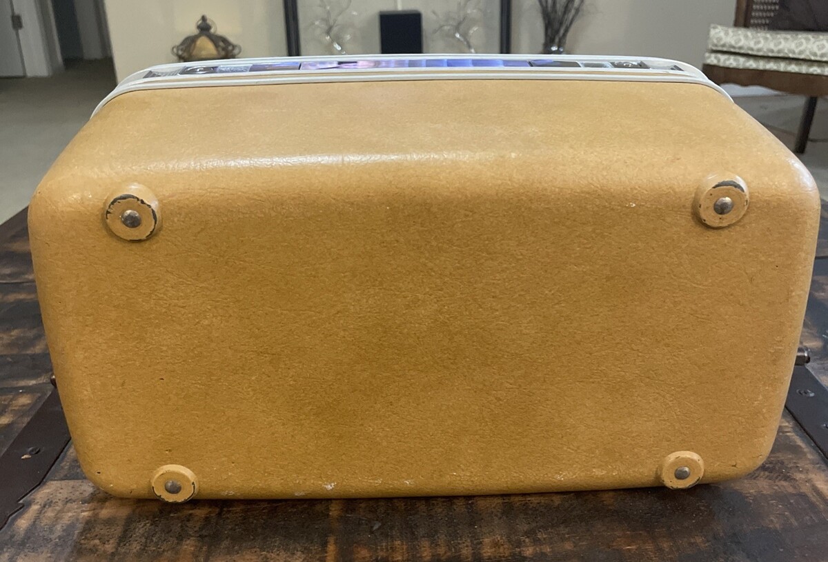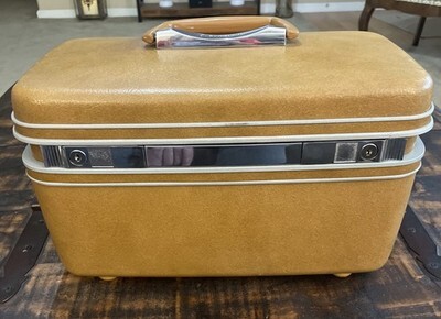 The Vintage Samsonite Silhouette Beauty Case in Tan/Beige color is a stylish and practical case with a retro design. This unisex adult-sized case features a hardcase construction, making it durable for travel. It includes a mirror for added convenience and is perfect for short trips or as a carry-on item. Made in the United States, this 15" case is a unique and classic addition to any vintage luggage collection.