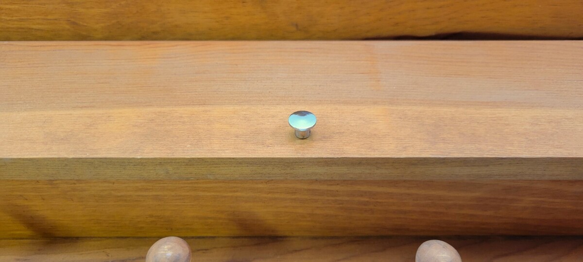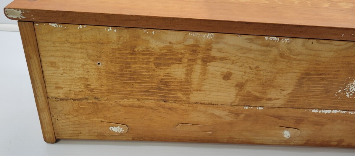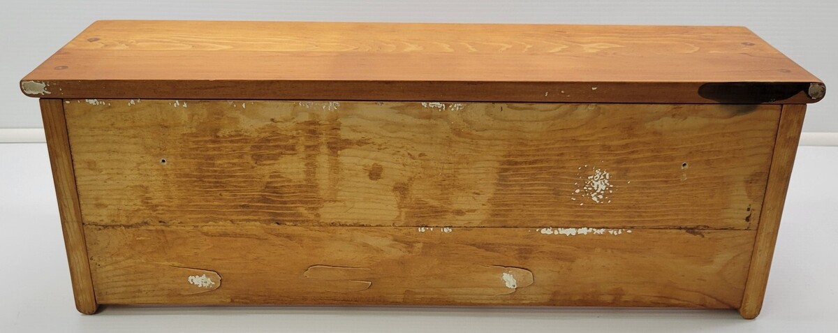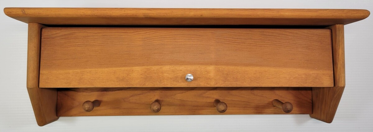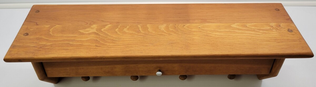 Rack is in vintage used condition and hung in a summer home for many years. The knob was replaced at some point many years ago and is not original. There is some cracking on the backside of the pegs which has been like that since originally hung with solid pegs. One of the side decorative finishing screw hole plugs is missing.
