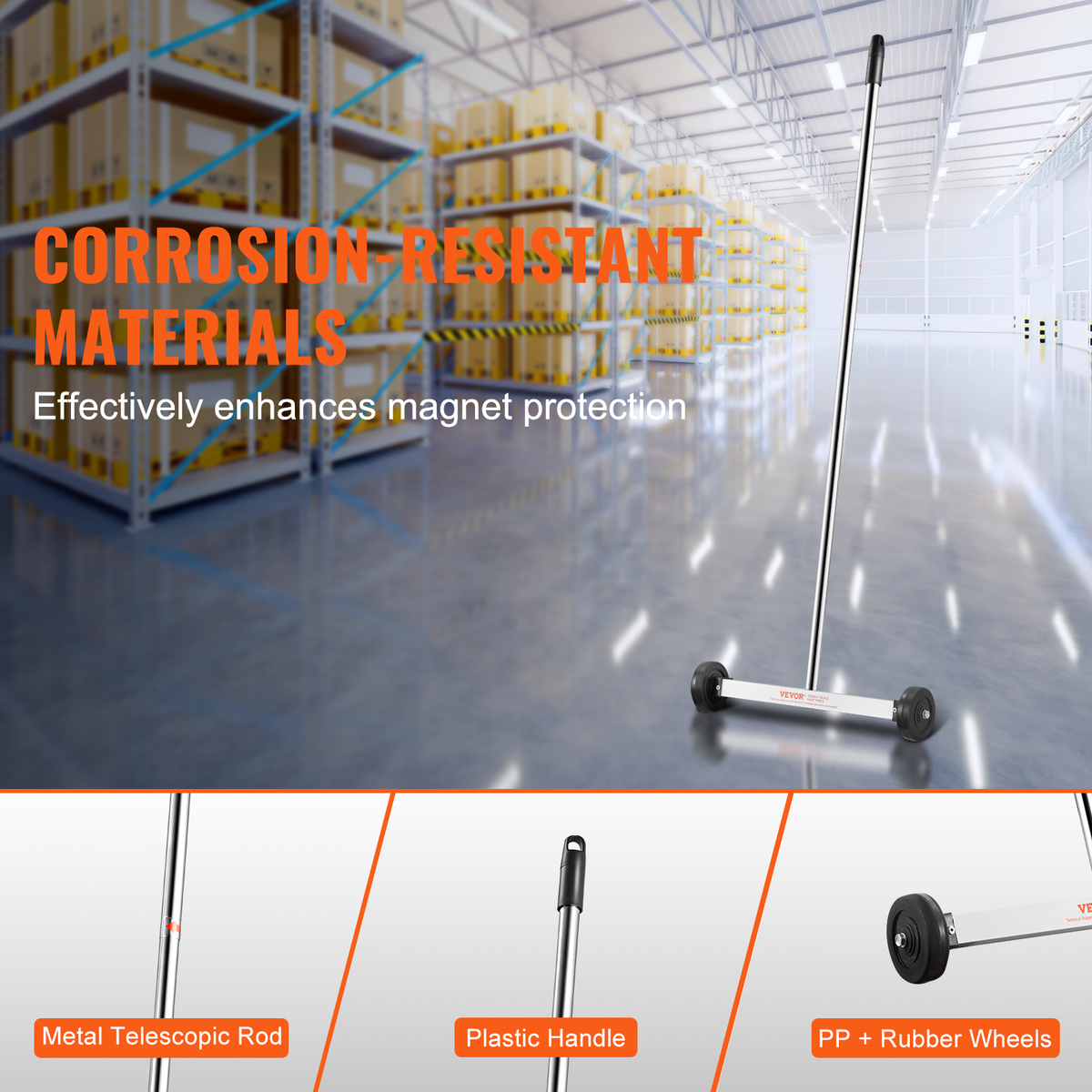 Durable Construction: Made from high-quality materials including aluminum, plastic, magnets, and iron, the nail magnet sweeper withstands demanding work environments. Featuring an aluminum alloy shell that's durable and corrosion-resistant. The anti-disassembly screw design ensures stability, while the PP + rubber wheels provide durability and traction.